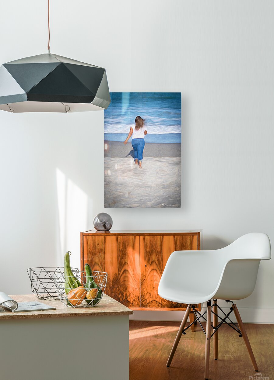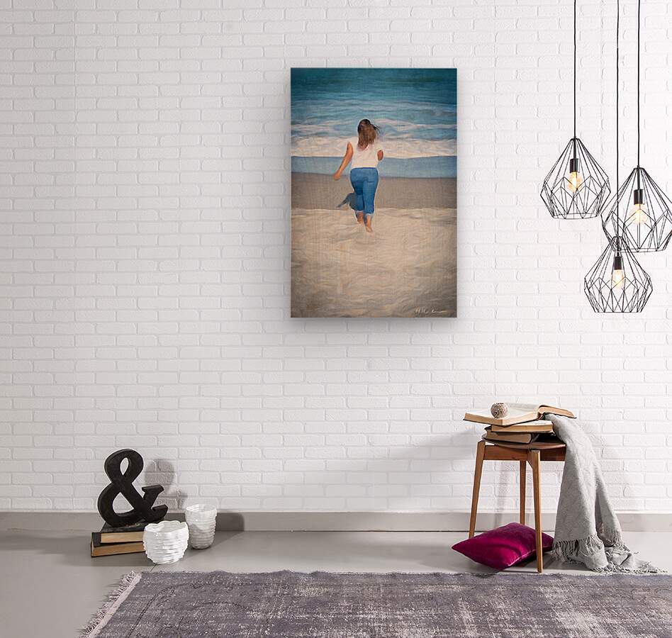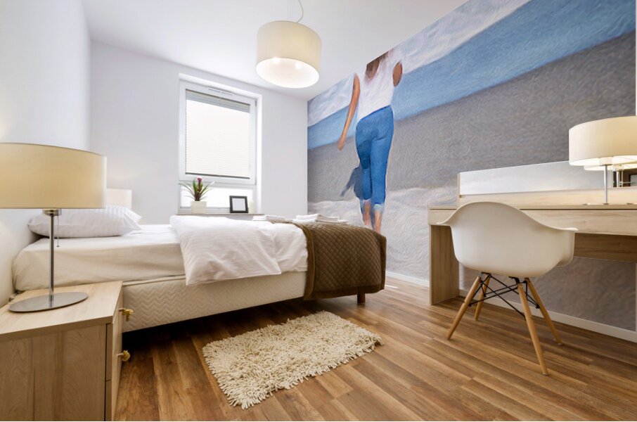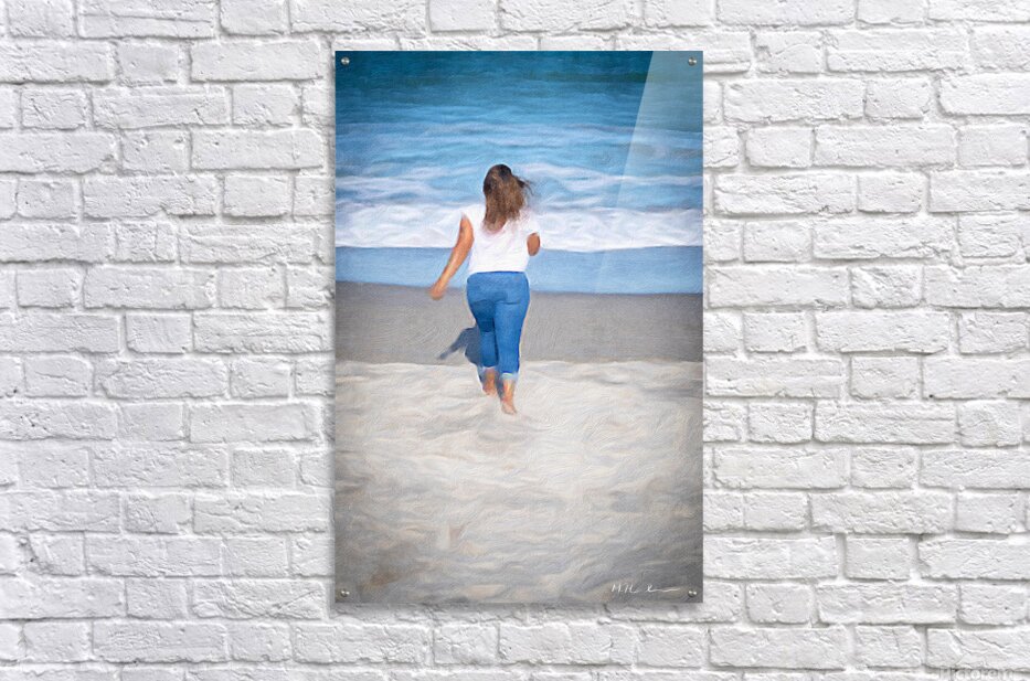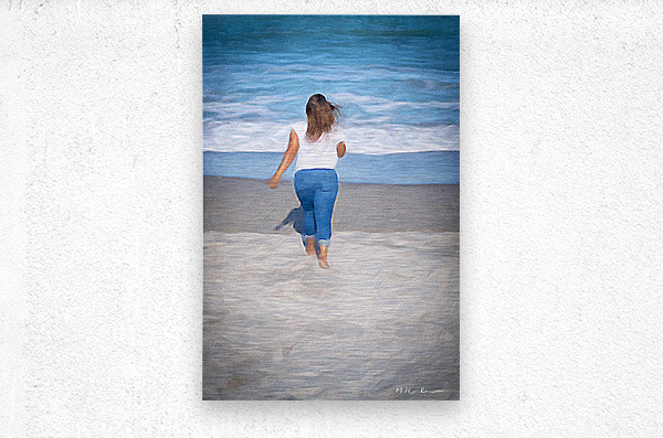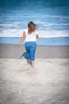 This artwork captures a serene moment of a person walking towards the ocean. The individual is barefoot, wearing blue pants and a white top, with hair flowing freely. The scene is set on a beach with gentle waves rolling in, creating a peaceful and inviting atmosphere. The contrast between the sandy shore and the blue sea highlights the natural beauty of the coastal environment. This piece evokes a sense of tranquility and the timeless allure of the sea.