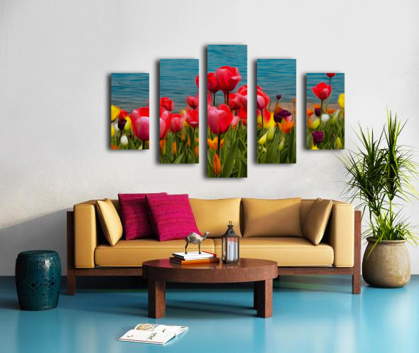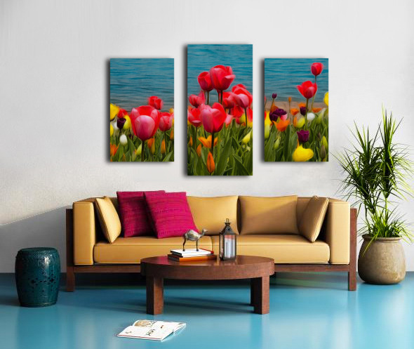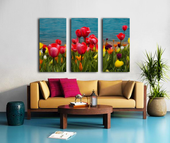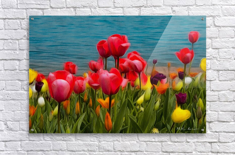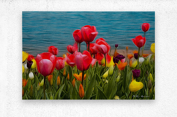 This vibrant artwork captures a stunning array of tulips in full bloom, set against the serene backdrop of a calm, blue body of water. The tulips, in shades of red, yellow, orange, and purple, create a lively and colorful foreground, contrasting beautifully with the tranquil water and sandy shore in the background. The rich colors and detailed depiction of the flowers make this piece both visually striking and soothing, evoking a sense of peace and natural beauty. The artist's signature can be seen in the bottom right corner, adding a personal touch to this captivating scene.