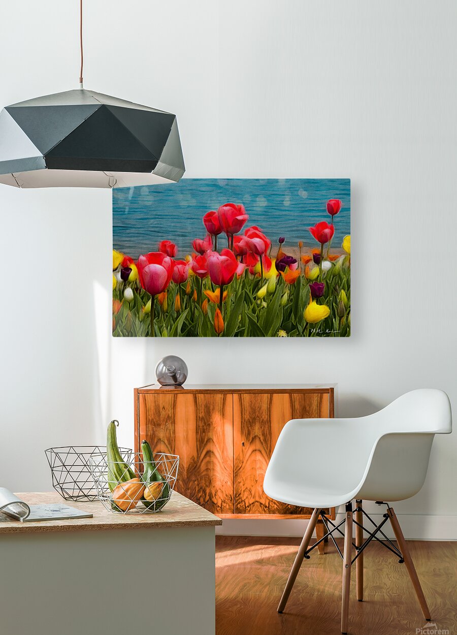 This vibrant artwork captures a stunning array of tulips in full bloom, set against the serene backdrop of a calm, blue body of water. The tulips, in ...[+]