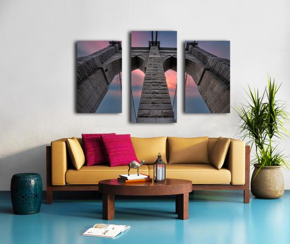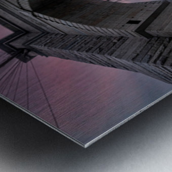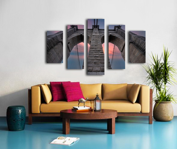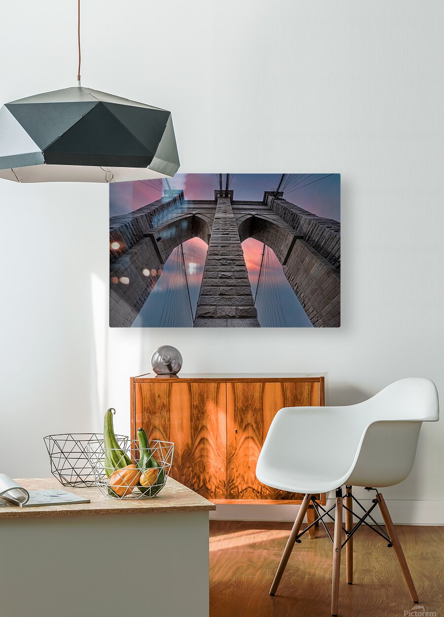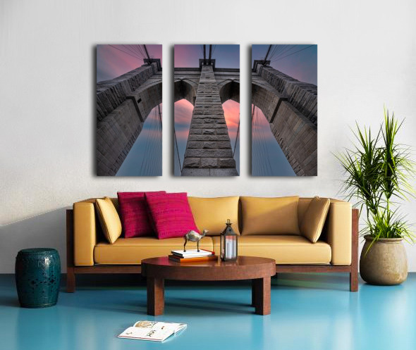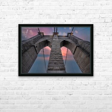 This captivating photograph captures the majestic architecture of the Brooklyn Bridge, viewed from below. The image focuses on the towering stone arches and the intricate network of suspension cables, set against a stunning sunset sky. The warm hues of the sunset, blending pink and orange, contrast beautifully with the cool tones of the stone structure, creating a visually striking composition. The perspective emphasizes the grandeur and engineering marvel of the bridge, making it a compelling piece for any art gallery.