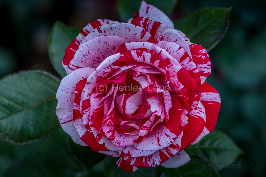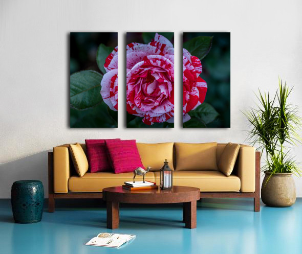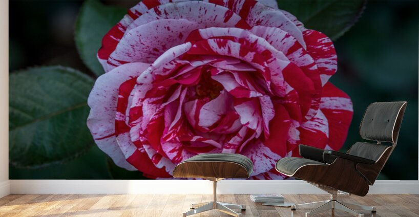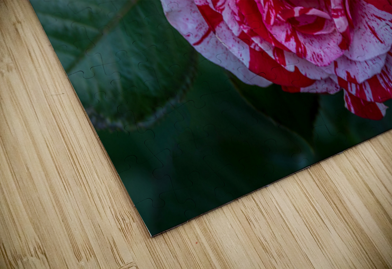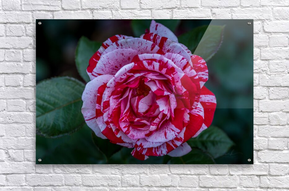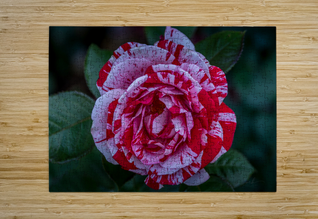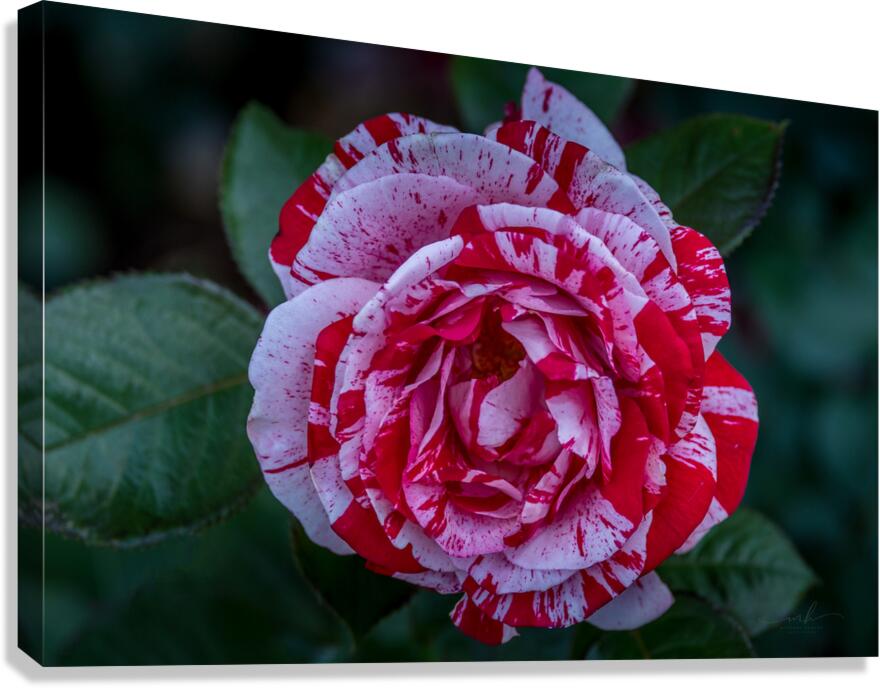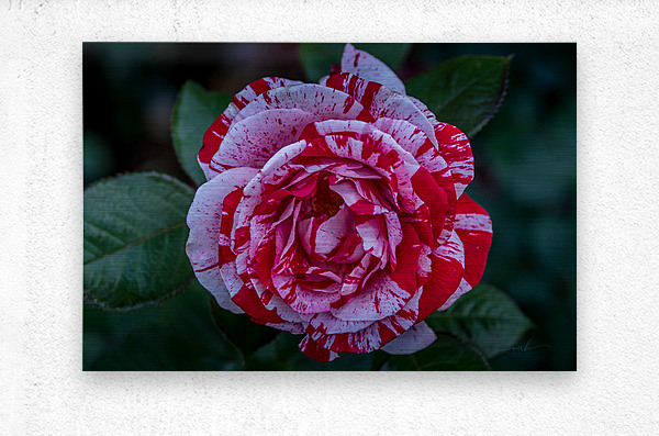 This photograph, titled "Peppermint Bloom," captures the striking beauty of a variegated rose. The petals of the rose are adorned with a unique pattern of red and white stripes, reminiscent of a peppermint candy. The intricate details and vibrant colors of the flower are highlighted against a backdrop of lush green leaves, making it a captivating and visually appealing piece. The image is a testament to the natural artistry found in flora and is sure to draw the viewer's attention with its vivid contrast and delicate elegance.