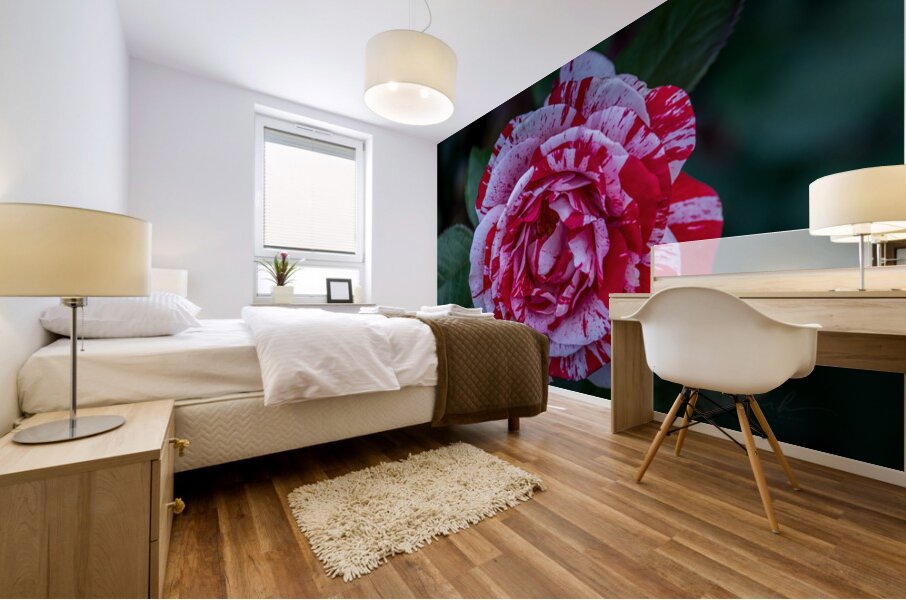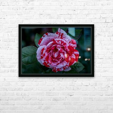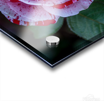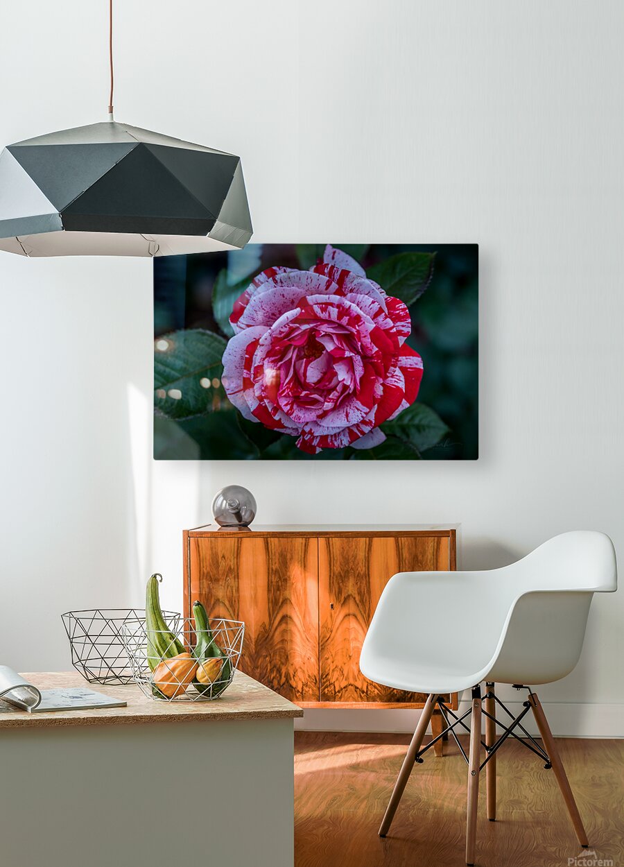 This photograph, titled "Peppermint Bloom," captures the striking beauty of a variegated rose. The petals of the rose are adorned with a unique patter...[+]