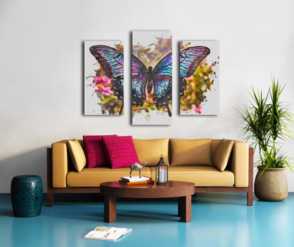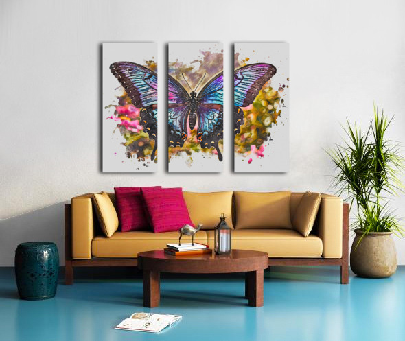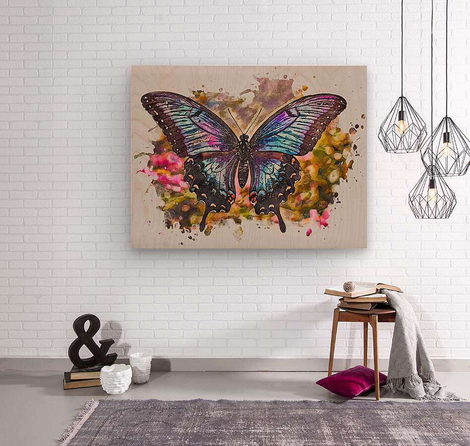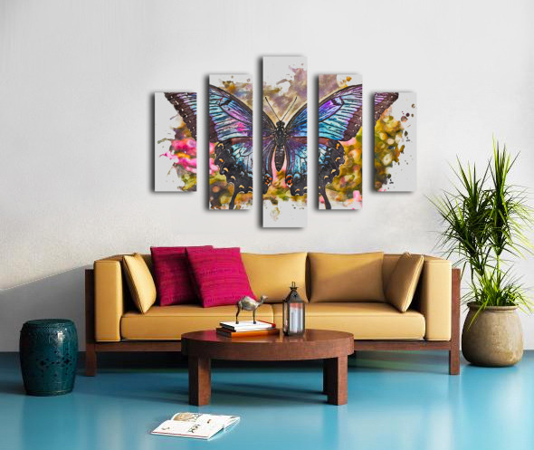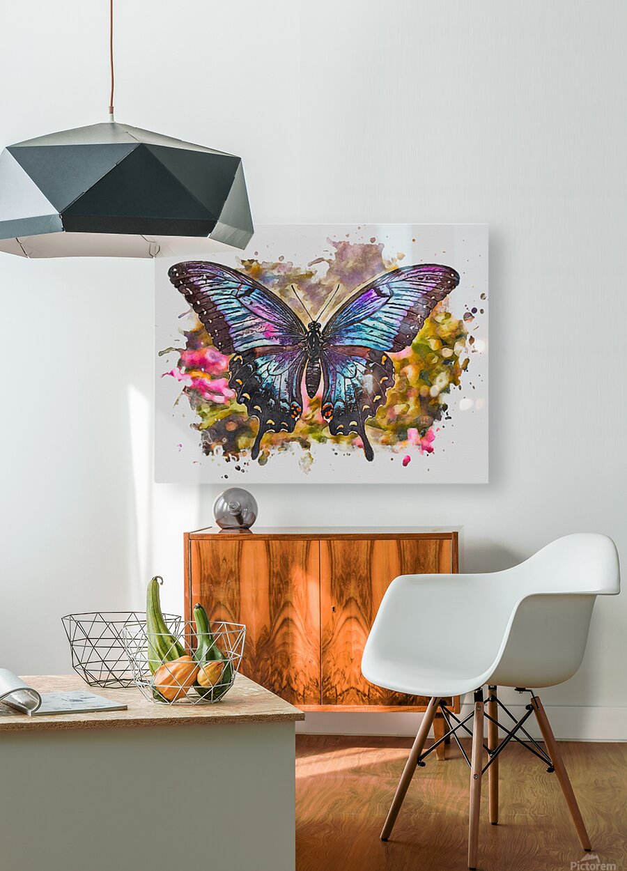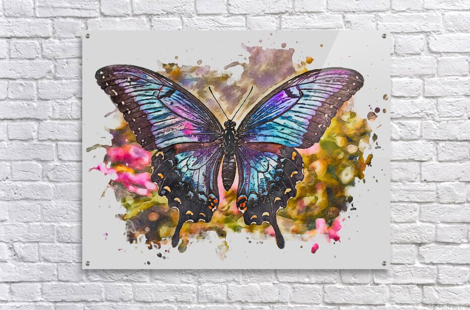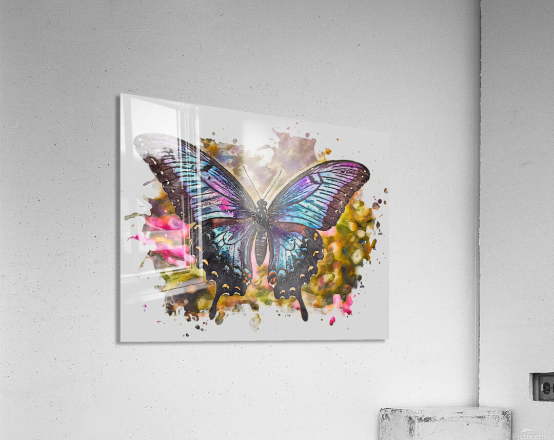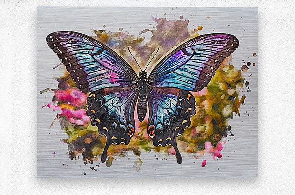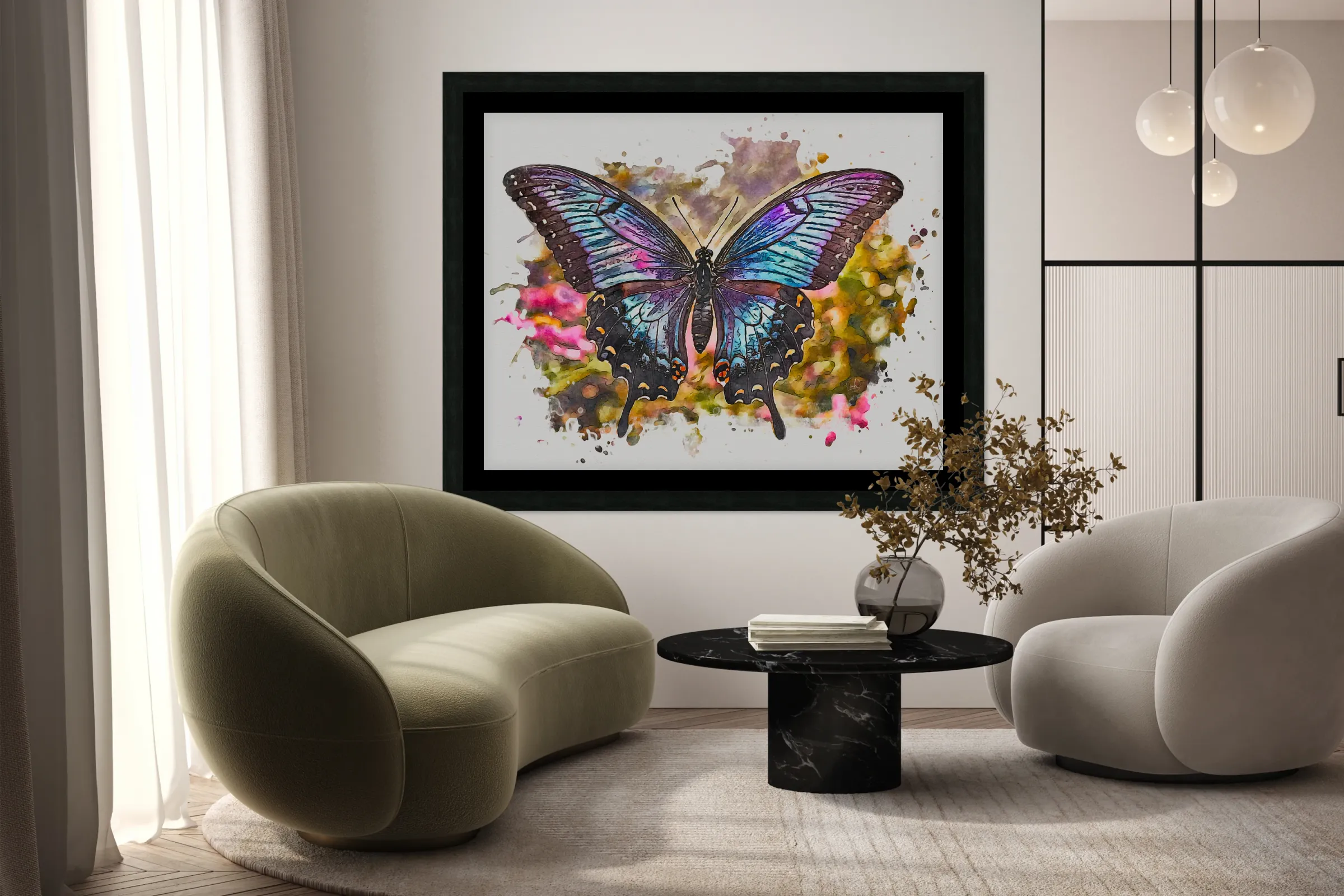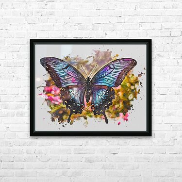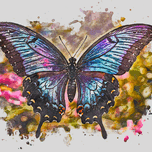 A butterfly poised in mid-flight, its indigo and violet wings edged in shadow and fire, radiates against a backdrop of spontaneous color, like memory ...[+]
