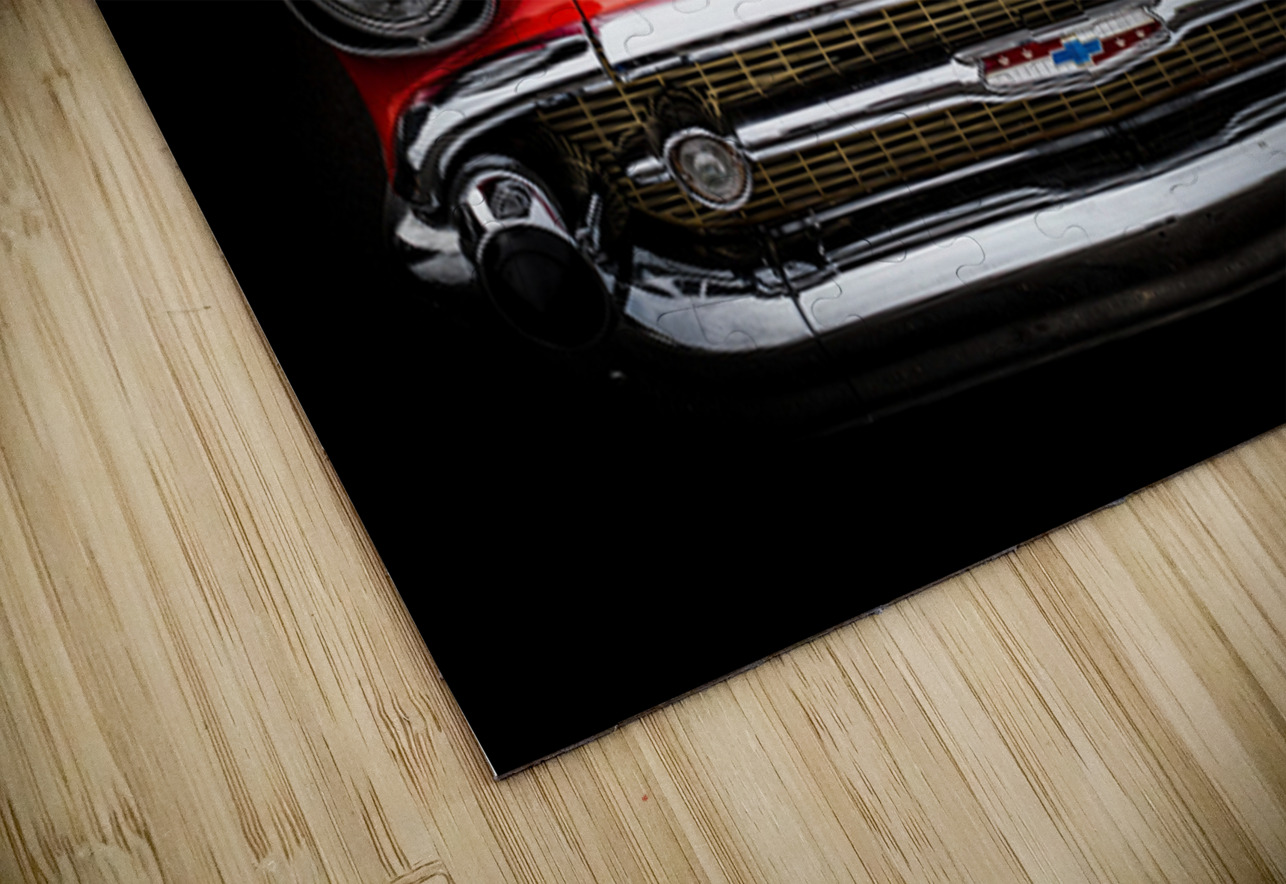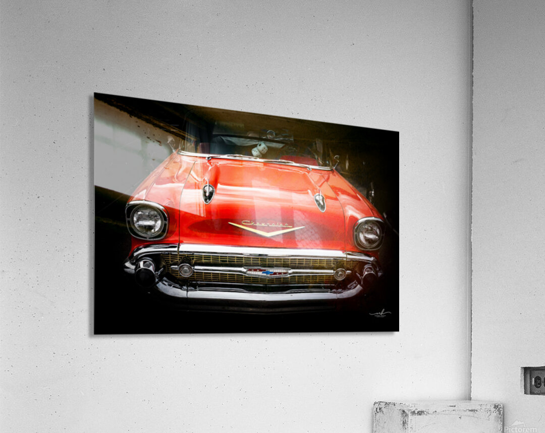 This photograph, titled "Classic Elegance," captures the front view of a beautifully restored vintage red Chevrolet car. The gleaming chrome accents a...[+]