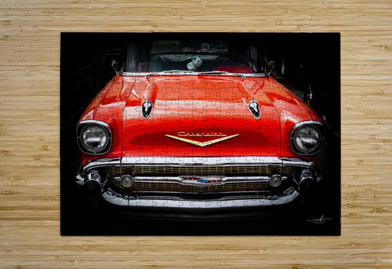 This photograph, titled "Classic Elegance," captures the front view of a beautifully restored vintage red Chevrolet car. The gleaming chrome accents and the iconic Chevrolet emblem on the grille highlight the timeless design and craftsmanship of this classic automobile. The dice hanging from the rearview mirror add a nostalgic touch, evoking memories of a bygone era. This piece is a celebration of automotive history and the enduring allure of classic cars.