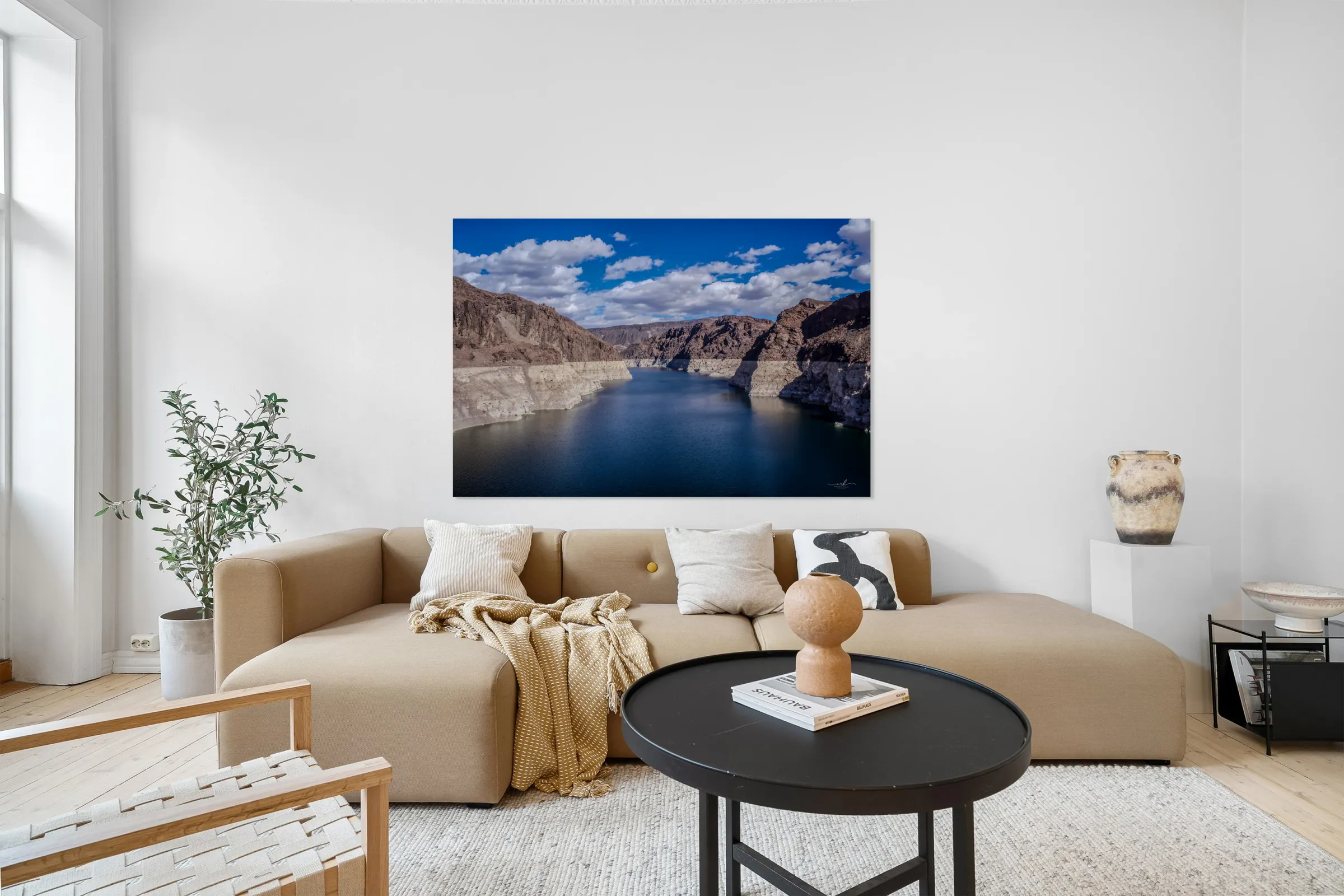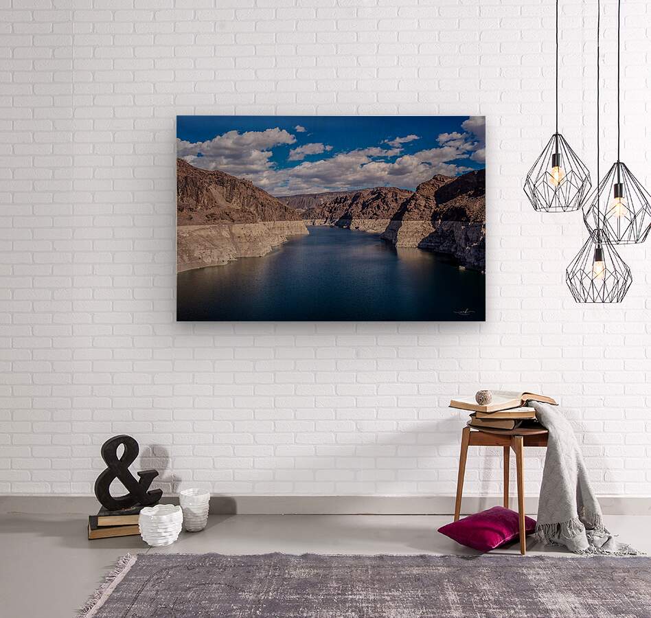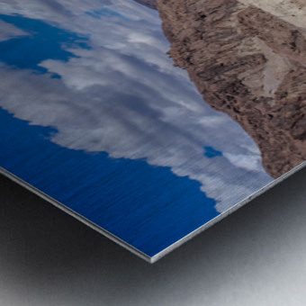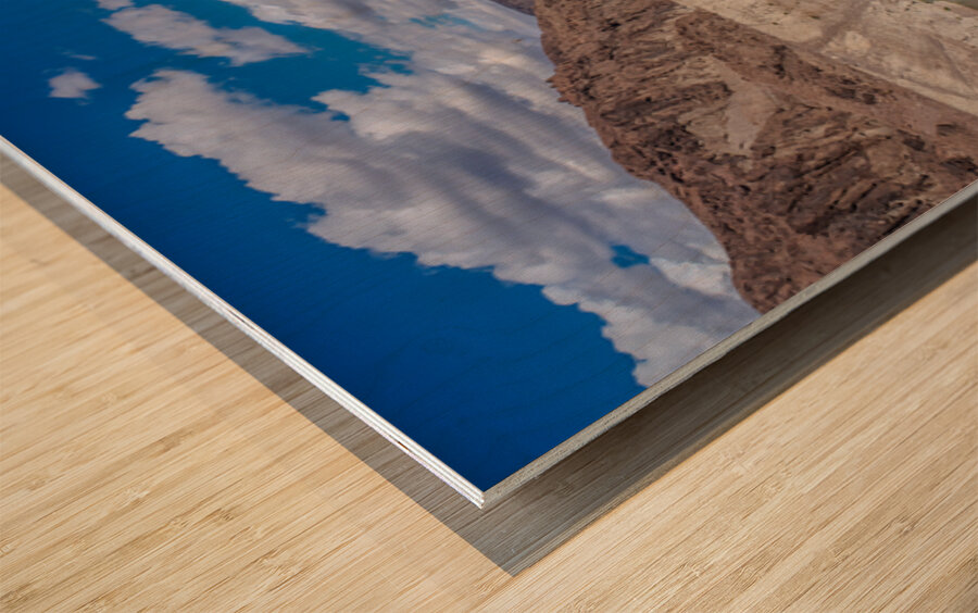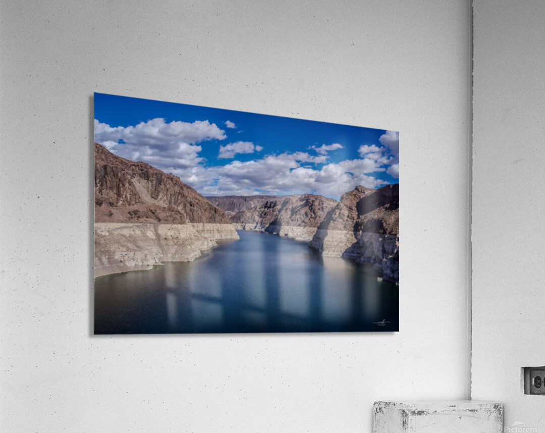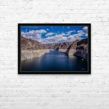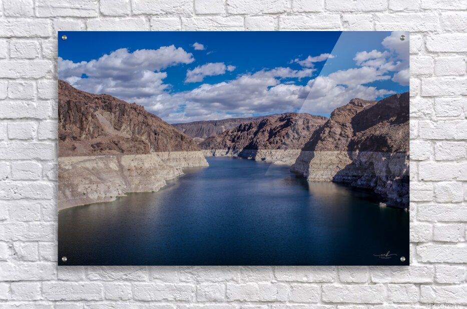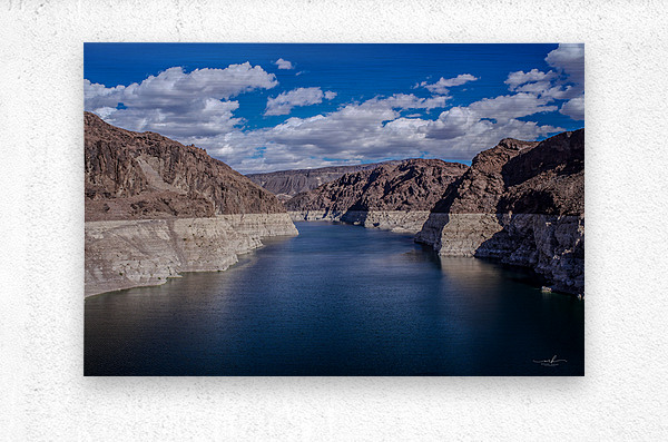 This captivating photograph showcases a serene body of water nestled between rugged, rocky cliffs under a vibrant blue sky adorned with scattered clouds. The contrast between the deep blue water and the arid, sunlit cliffs creates a striking visual harmony. The image captures the essence of natural tranquility and the timeless beauty of geological formations, making it a compelling addition to any art gallery.