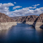 This captivating photograph showcases a serene body of water nestled between rugged, rocky cliffs under a vibrant blue sky adorned with scattered clou...[+]