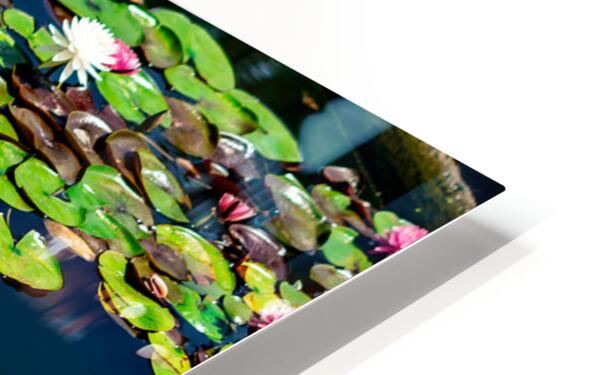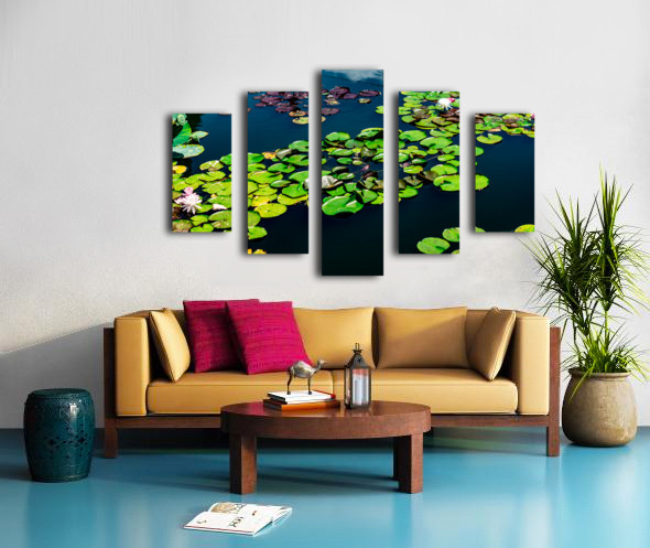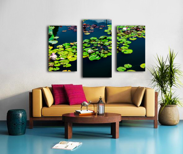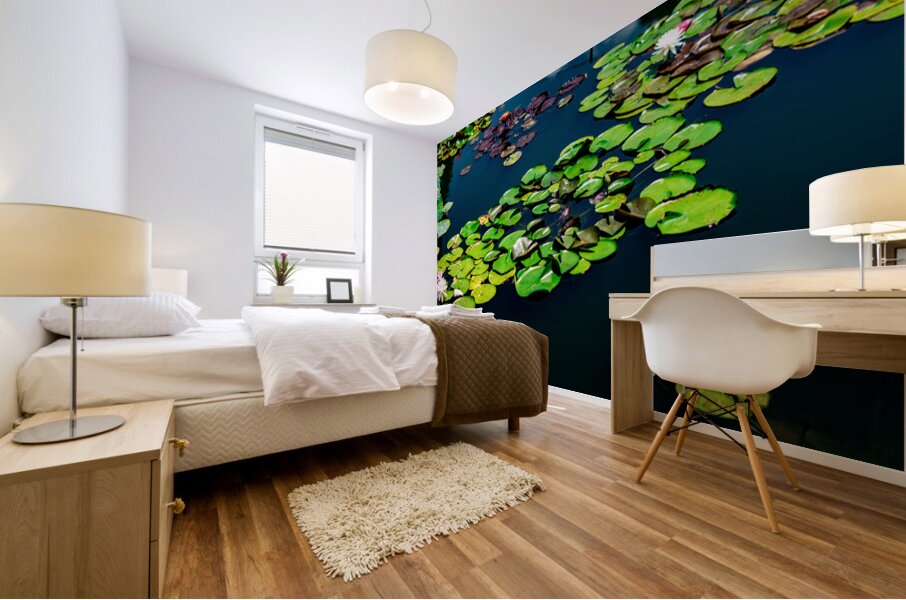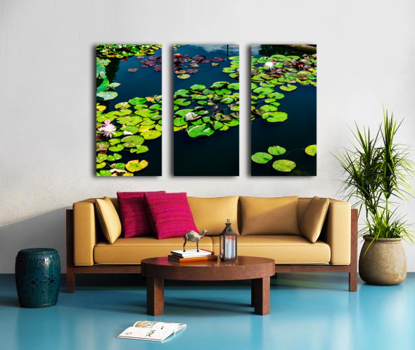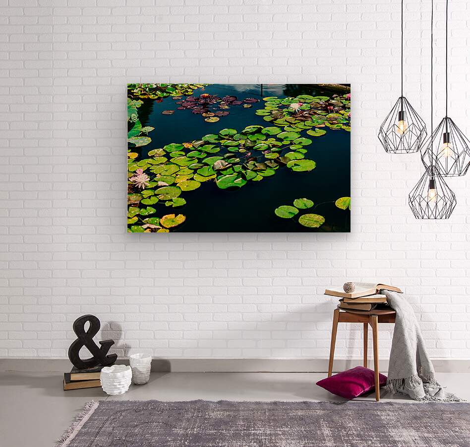 A tranquil mosaic of lily pads drifts across a sapphire pond, each leaf a quiet witness to the rhythm of nature. Shades of emerald and plum mingle with the soft bloom of pink and white water lilies, their petals unfolding like secrets in the morning light. The water mirrors the sky’s hush, creating a layered dance of reflection and life. This piece invites stillness—a moment to breathe, to listen, to feel the gentle pulse of transformation beneath the calm.
