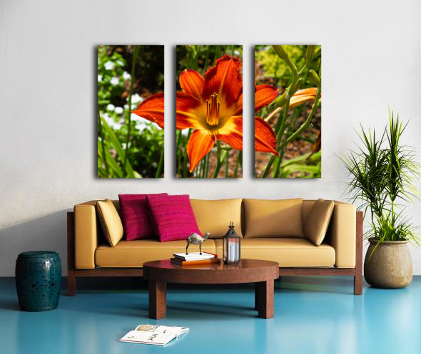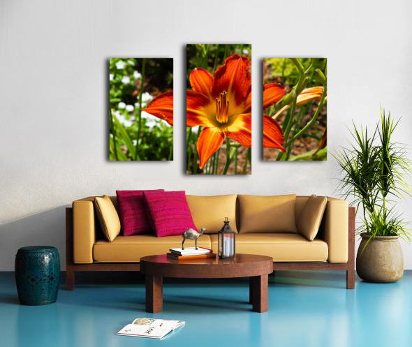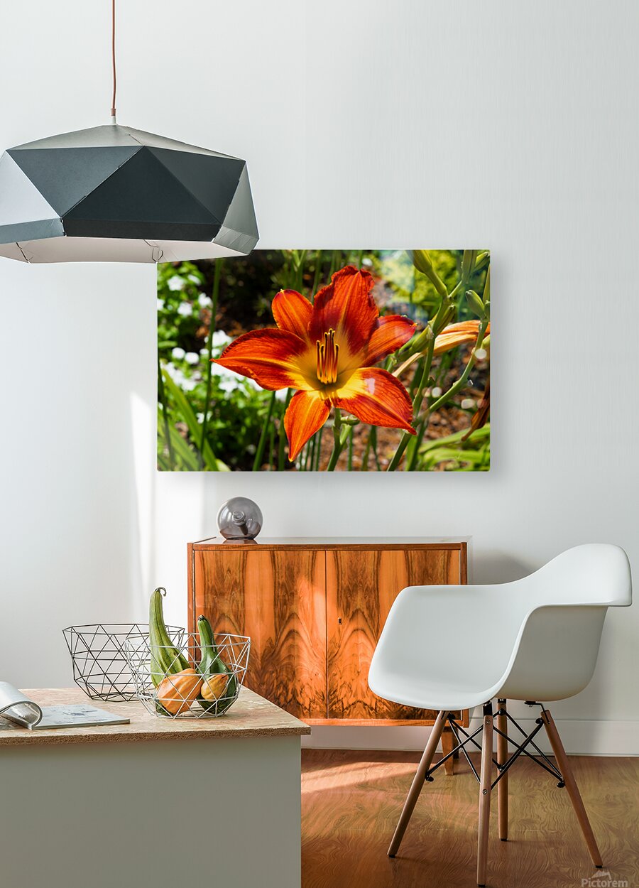 A daylily ignites the frame in hues of flame, orange petals streaked with crimson, cradling a golden heart. Its sixfold symmetry radiates strength, w...[+]