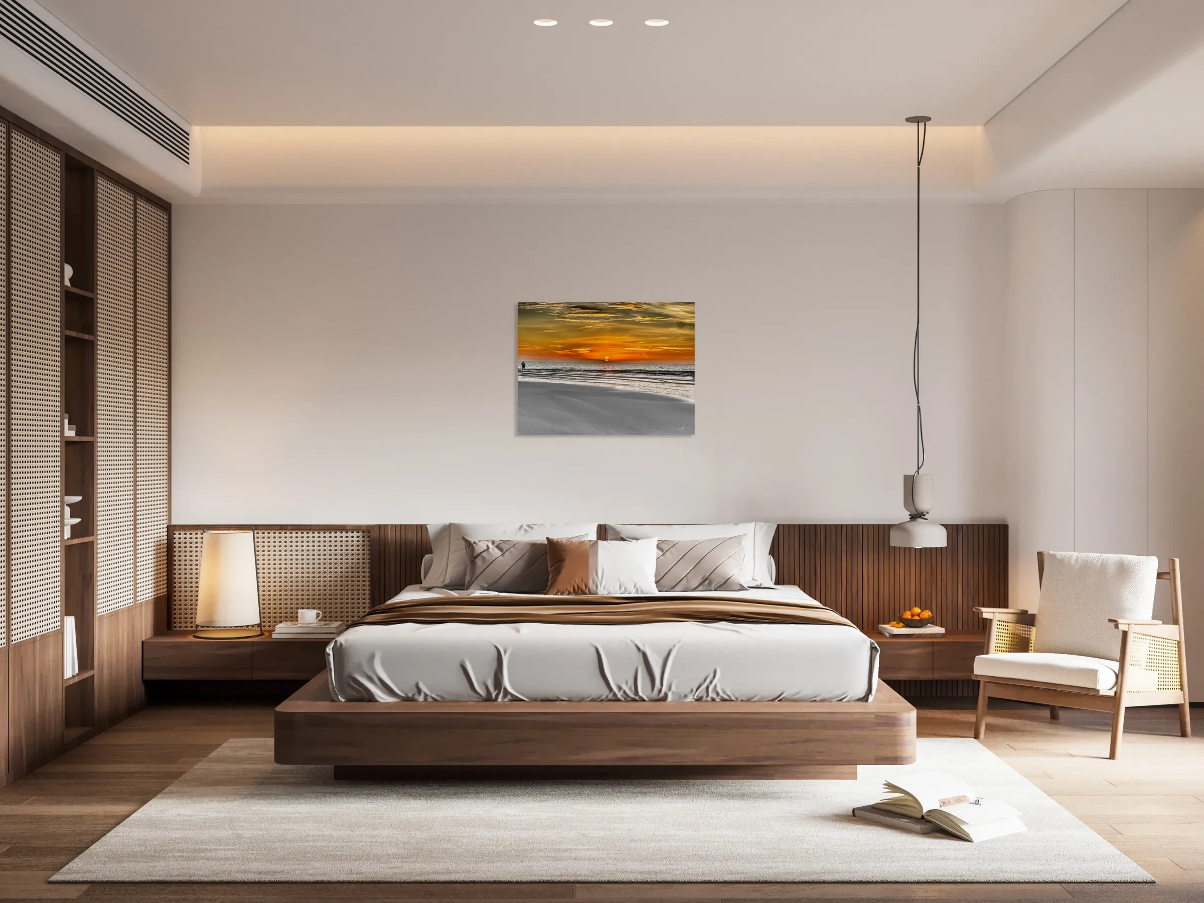 A tranquil beach bathed in the golden hush of sunset, where sky and sea melt into one fluid canvas of orange, red, and amber. The sun, half-surrendered to the horizon, casts shimmering reflections across gentle waves that kiss the shore. Two figures walk quietly along the water’s edge, their silhouettes softened by the fading light, companions to the solitude. A lone bird glides above, suspended between day and dusk. The sand, still damp from the tide’s retreat, holds delicate patterns like whispered memories. This scene is a meditation in motion, where time slows, and the world exhales.