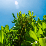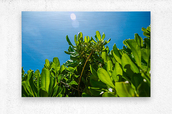 Bathed in golden sunlight, a lush green plant stretches skyward, its broad leaves glowing with vitality against a clear blue canvas. Captured from below, the perspective evokes growth, hope, and quiet resilience. Tiny buds nestle at the center, hinting at new life. Lens flares dance at the top, adding a dreamy shimmer that transforms this simple botanical moment into a celebration of nature’s upward reach.