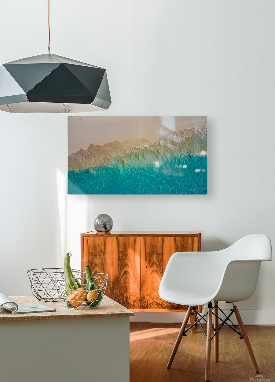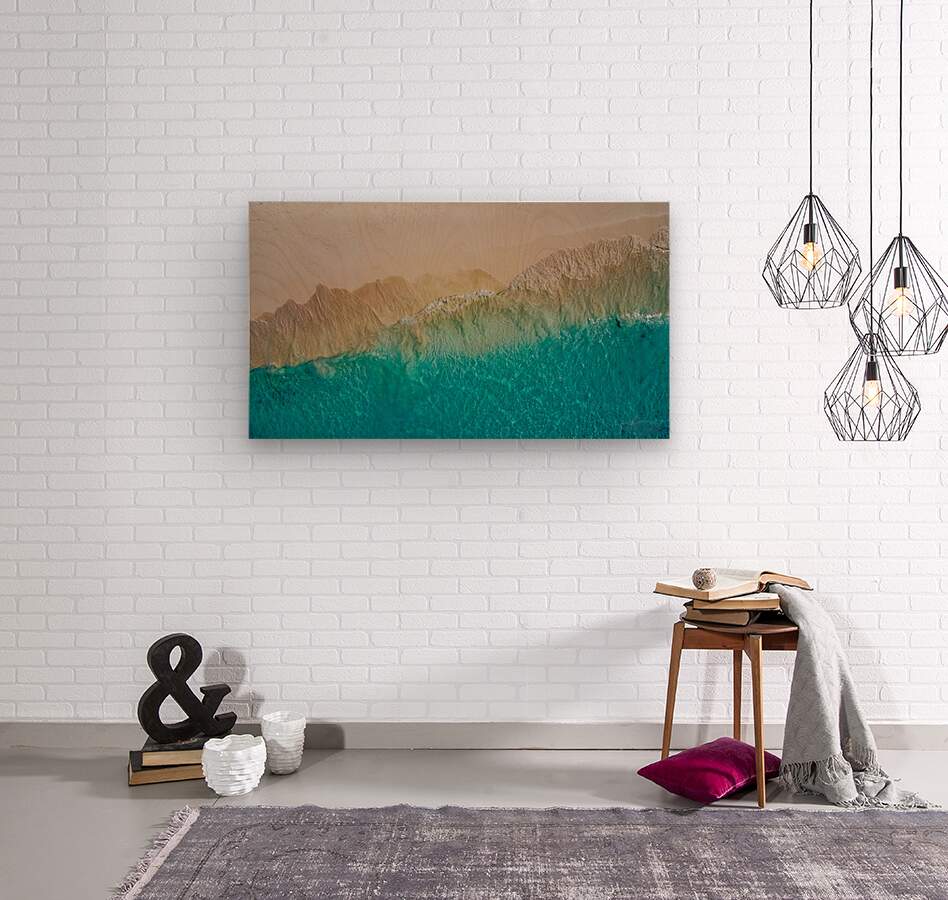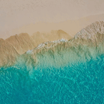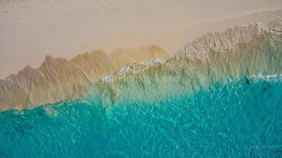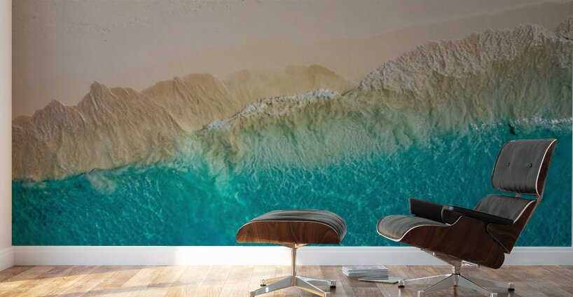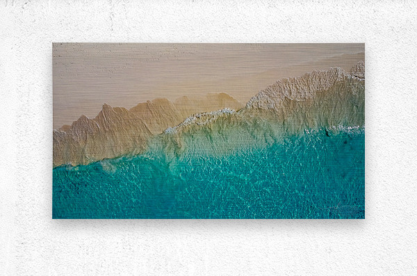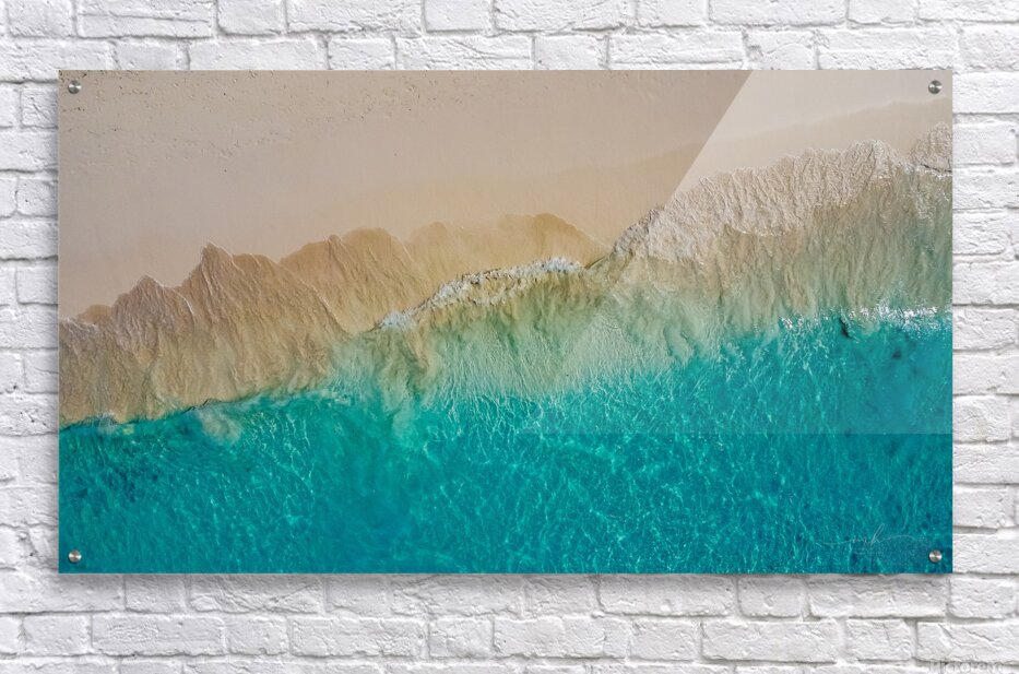 This captivating aerial photograph, titled "Summer Love," showcases the mesmerizing transition from a sandy shoreline to the vibrant turquoise waters of the ocean. The image captures the intricate textures and patterns formed by the waves as they gently lap against the shore. The contrast between the warm, earthy tones of the sand and the cool, refreshing hues of the water creates a visually stunning and serene composition. This piece evokes a sense of tranquility and the timeless beauty of nature, making it a perfect addition to any art collection.