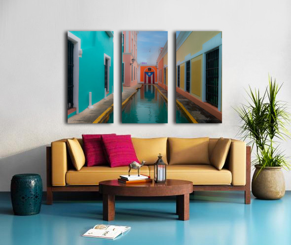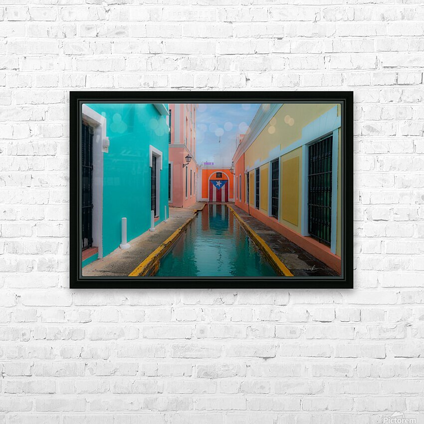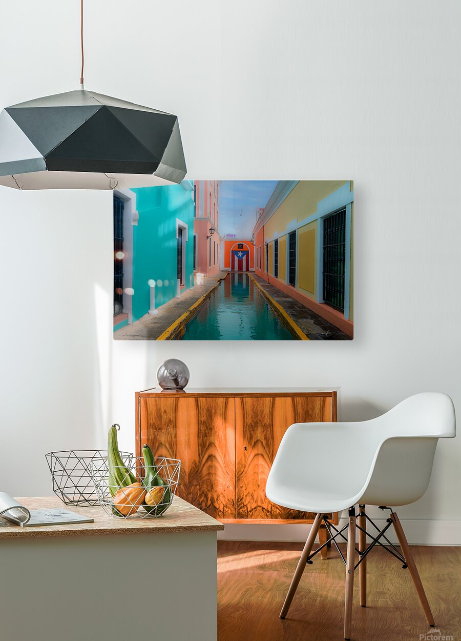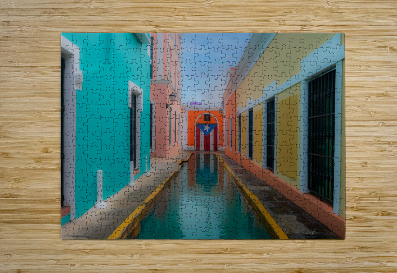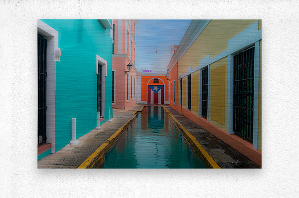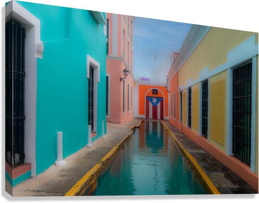 This evocative scene captures a narrow canal-lined alleyway nestled between vibrant colonial buildings in Puerto Rico. On the left, a turquoise façad...[+]