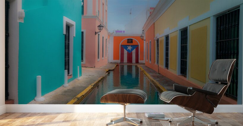 This evocative scene captures a narrow canal-lined alleyway nestled between vibrant colonial buildings in Puerto Rico. On the left, a turquoise façade with crisp white trim radiates cool serenity, while the right side bursts with warmth in yellow and orange tones. At the alley’s end, a striking mural of the Puerto Rican flag—bold red and white stripes, a blue triangle, and a solitary white star—stands as a proud emblem of cultural identity and resilience. The water mirrors the colors and textures above, doubling the visual poetry and inviting reflection, both literal and emotional. This image is a celebration of heritage, architecture, and the quiet beauty found in everyday corners.