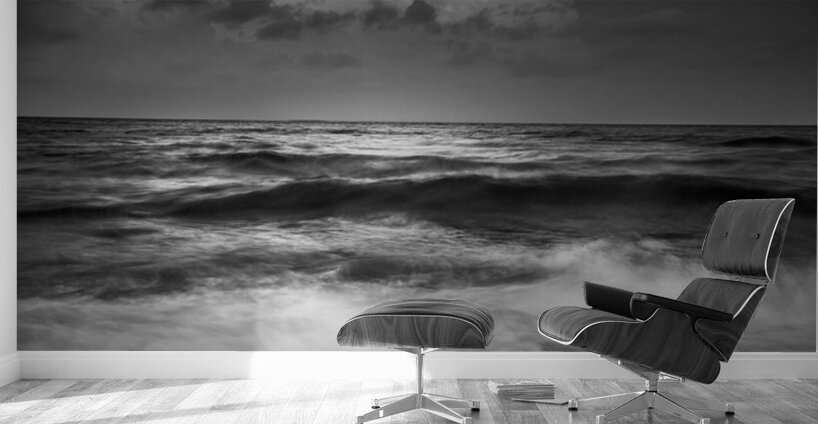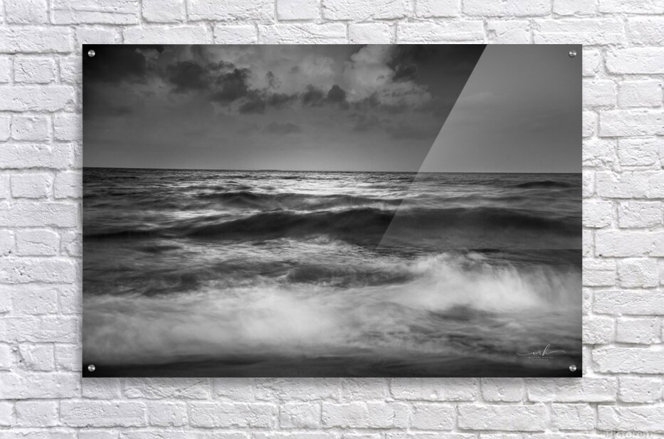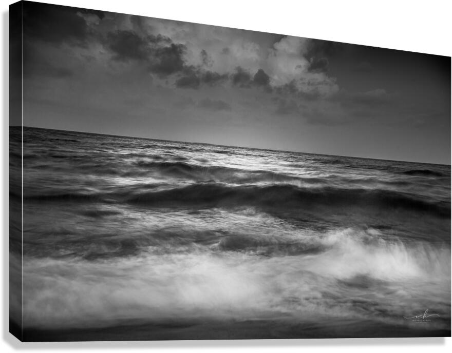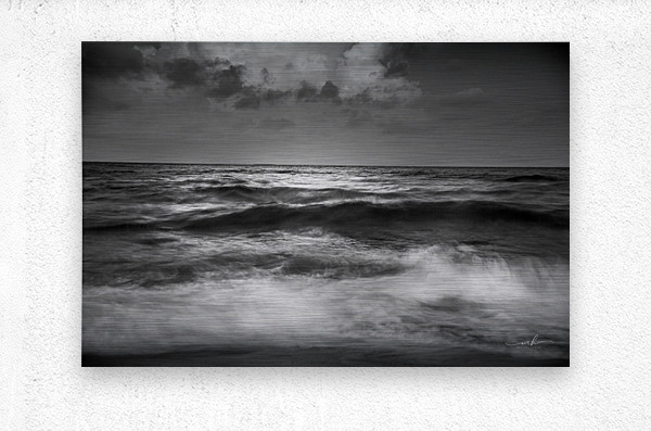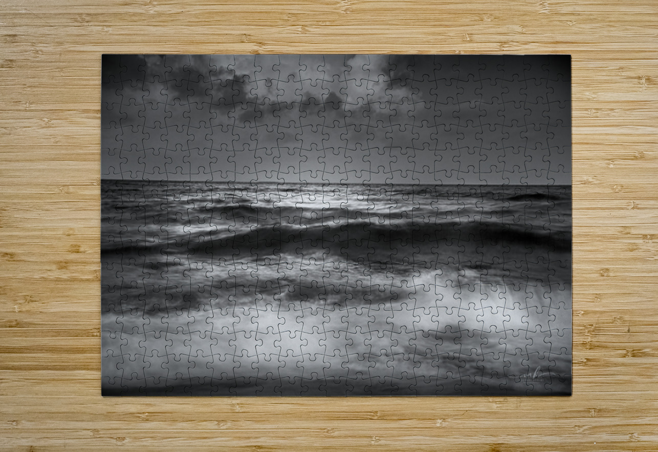 This black and white photograph captures the mesmerizing beauty of the ocean waves under a dramatic sky. The interplay of light and shadow on the water's surface creates a sense of movement and depth, while the clouds above add an element of mystery and grandeur. The image evokes a feeling of tranquility and awe, making it a captivating piece for any art collection.