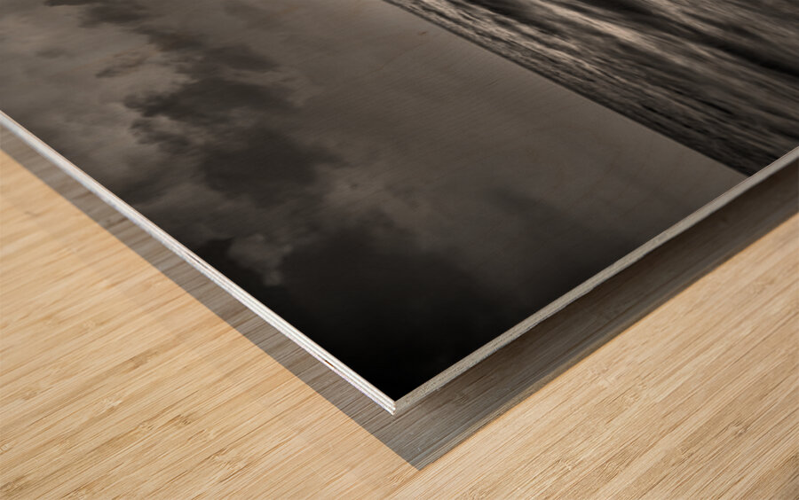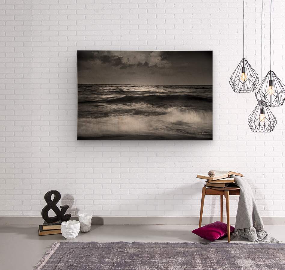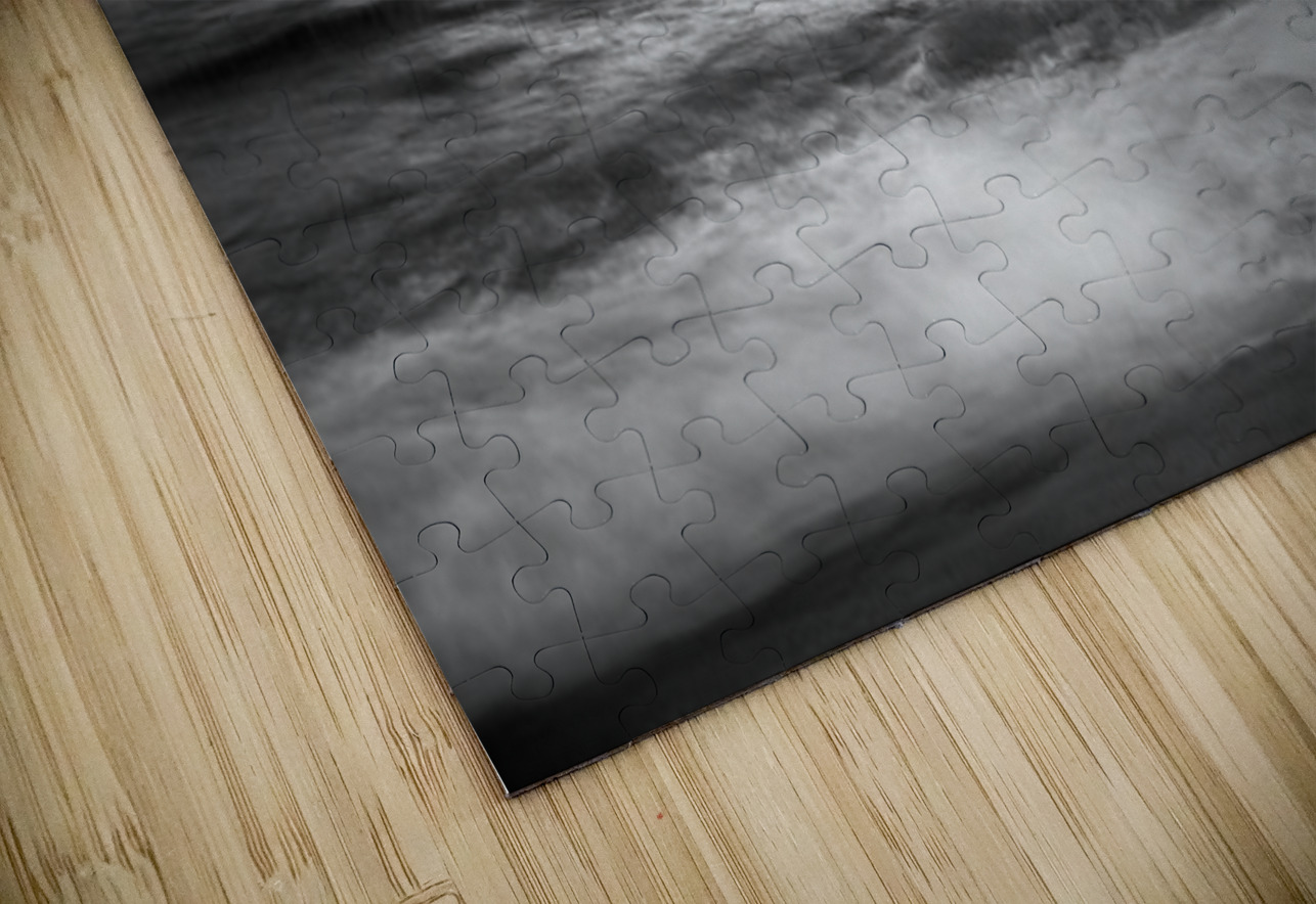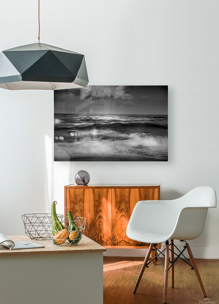 This black and white photograph captures the mesmerizing beauty of the ocean waves under a dramatic sky. The interplay of light and shadow on the water's surface creates a sense of movement and depth, while the clouds above add an element of mystery and grandeur. The image evokes a feeling of tranquility and awe, making it a captivating piece for any art collection.
