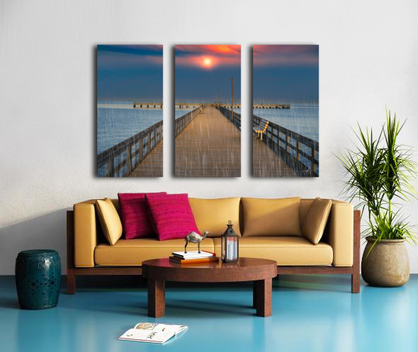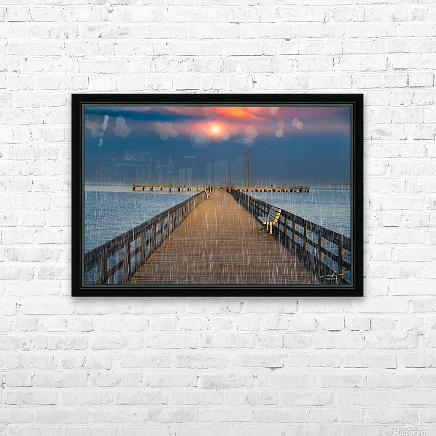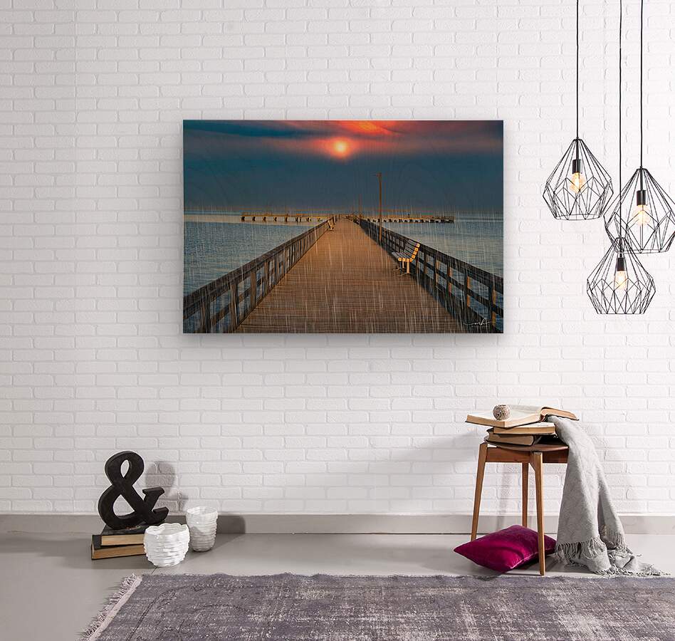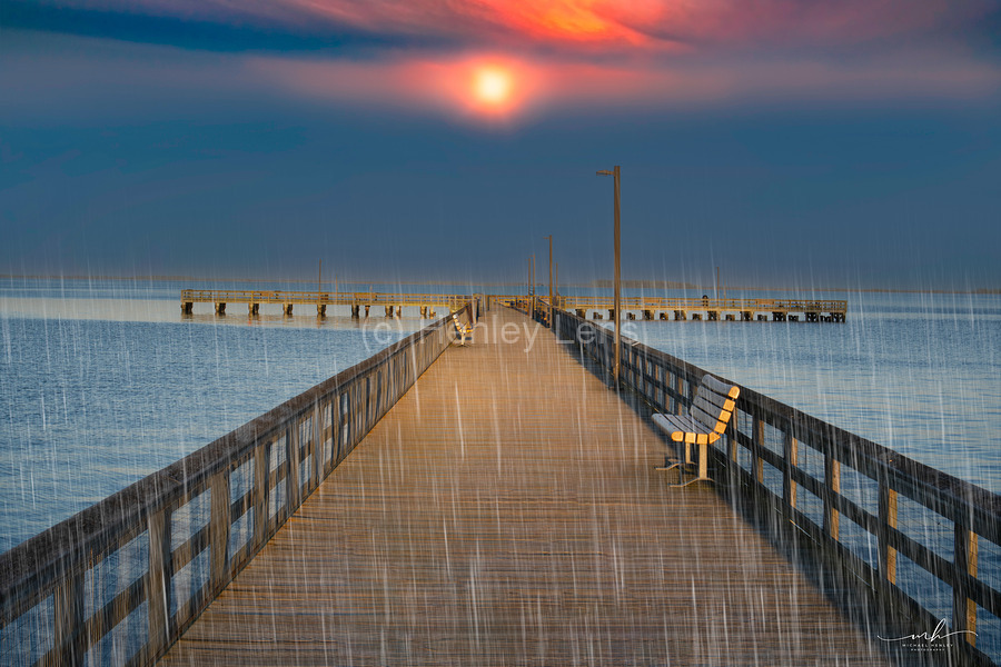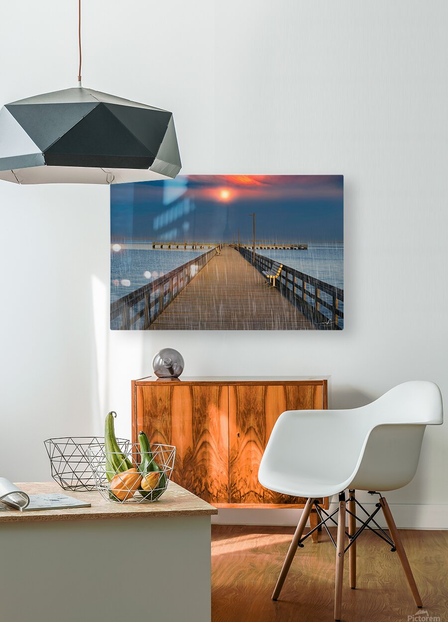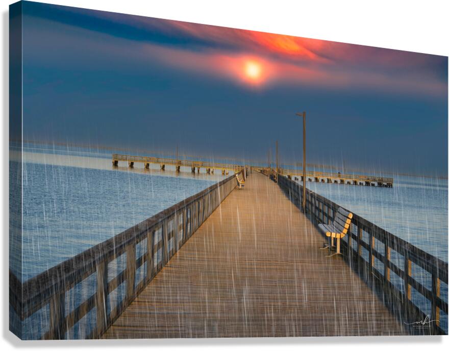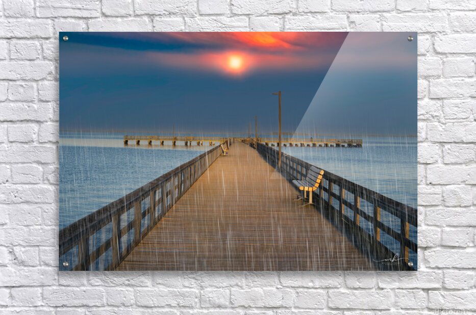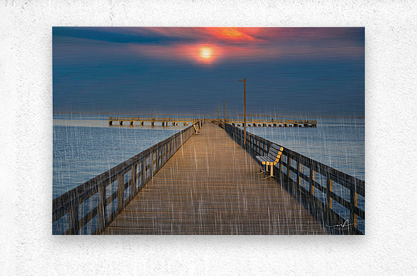 This evocative image captures a serene pier extending into a calm body of water, with a vibrant sunset casting a warm glow across the sky. The scene is made more poignant by the gentle rain falling, creating a sense of tranquility and solitude. A single bench on the right side of the pier invites contemplation, while the distant horizon and the soft hues of the sunset add depth and beauty to the composition. The combination of natural elements and the quiet, empty pier evokes a peaceful yet introspective mood, making it a compelling piece for any art gallery.