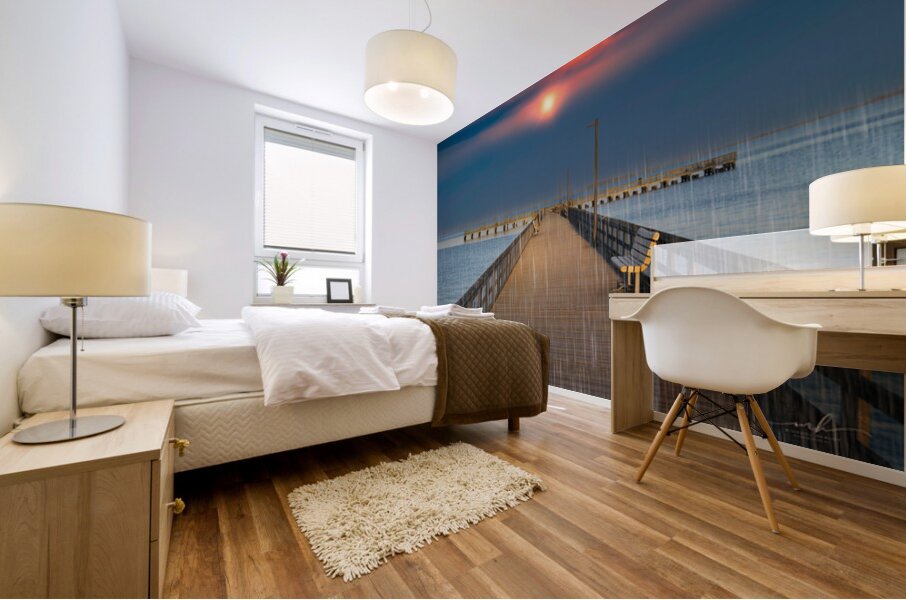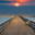 This evocative image captures a serene pier extending into a calm body of water, with a vibrant sunset casting a warm glow across the sky. The scene i...[+]