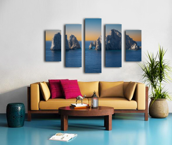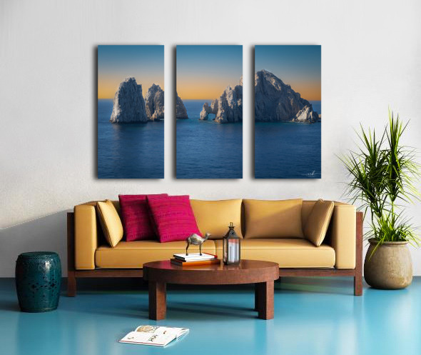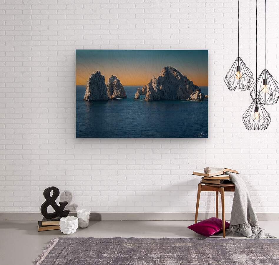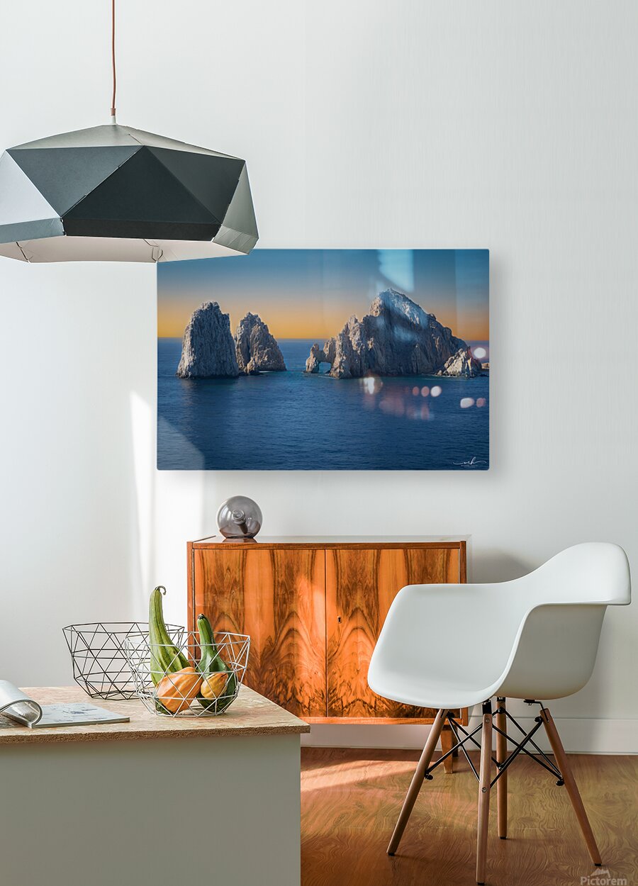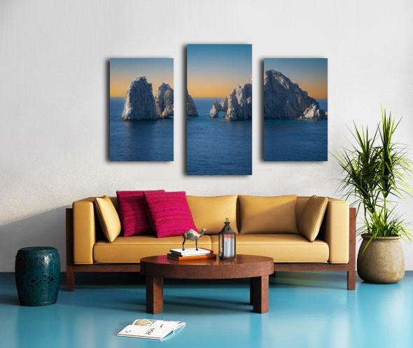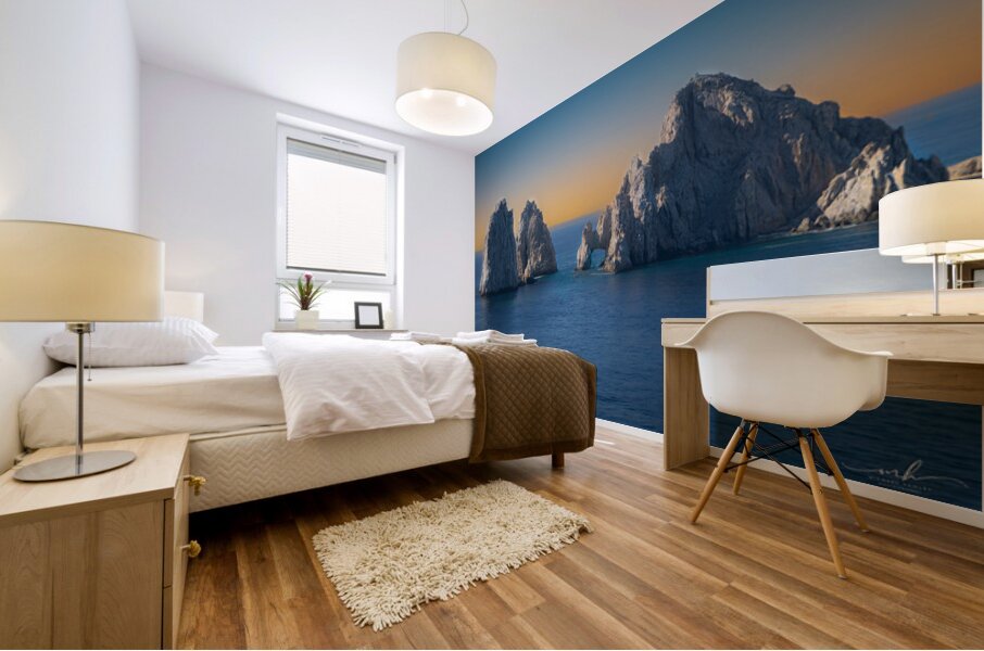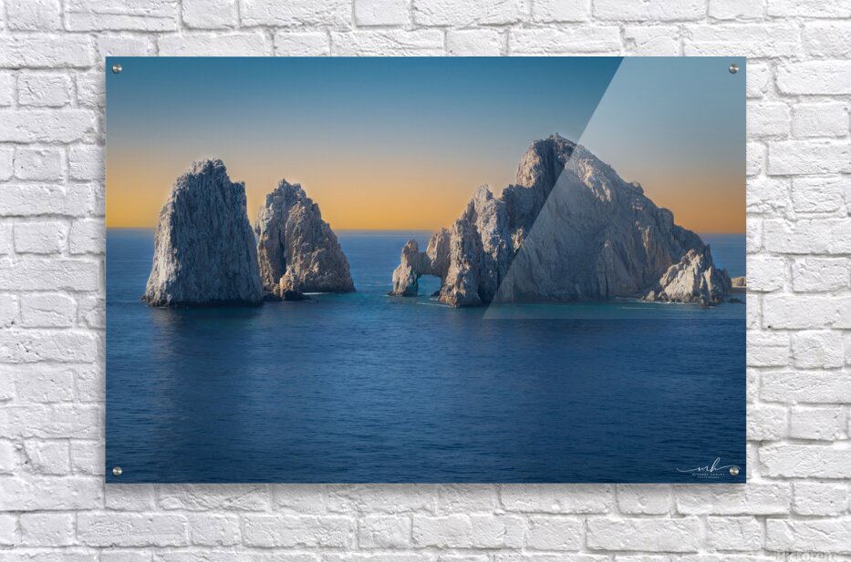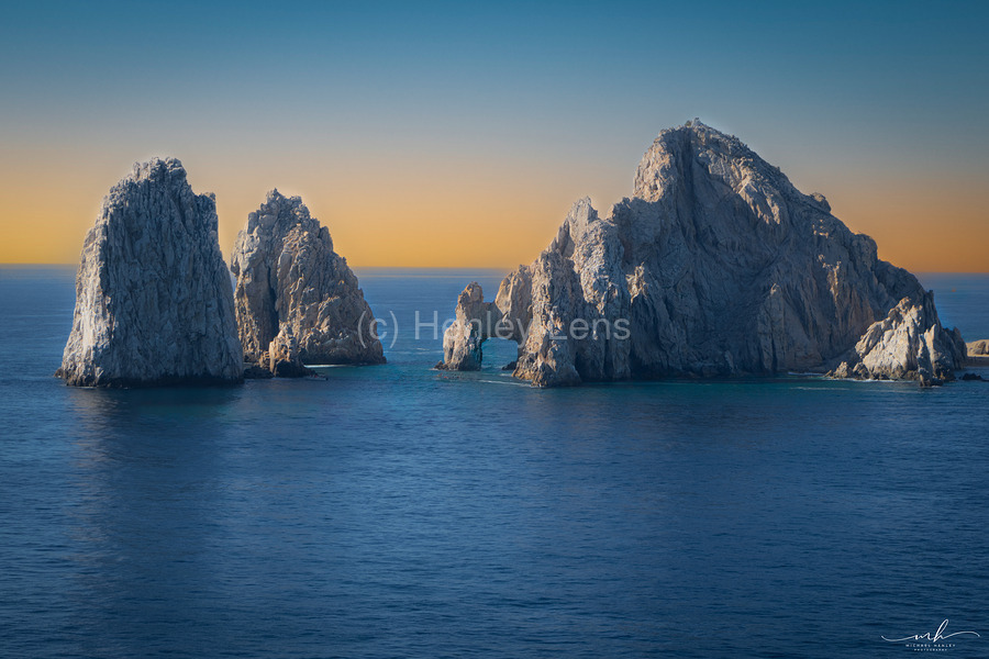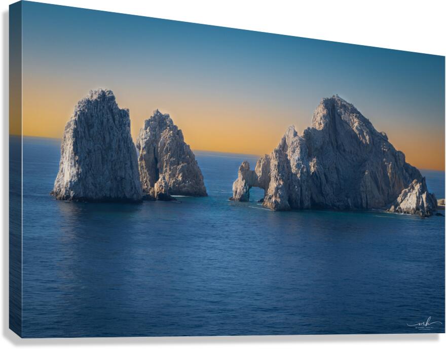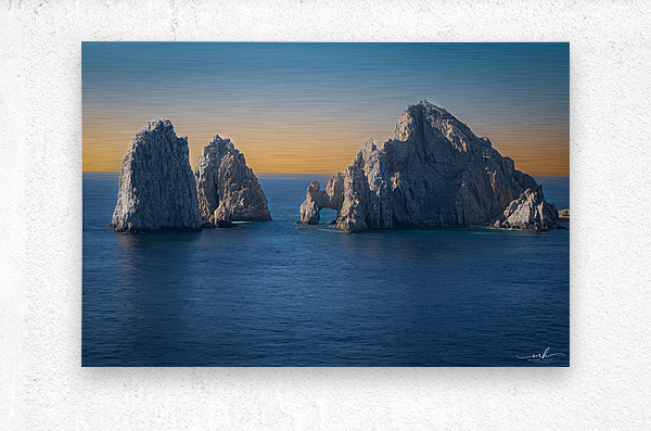 This captivating photograph captures the iconic rock formations of El Arco de Cabo San Lucas, located at the southern tip of the Baja California Peninsula in Mexico. The image showcases the dramatic cliffs rising from the deep blue waters of the Pacific Ocean, with the natural arch prominently featured. The sky transitions from a warm golden hue near the horizon to a deep blue as it ascends, indicating the time of sunset. The interplay of light and shadow on the rugged rock surfaces adds depth and texture to the scene, making it a visually striking and serene composition.