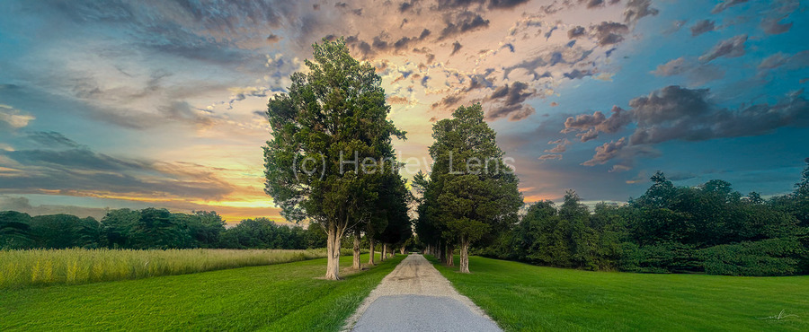 This captivating photograph captures a tranquil country road flanked by tall, lush trees on either side, leading the viewer's eye towards the hori...[+]