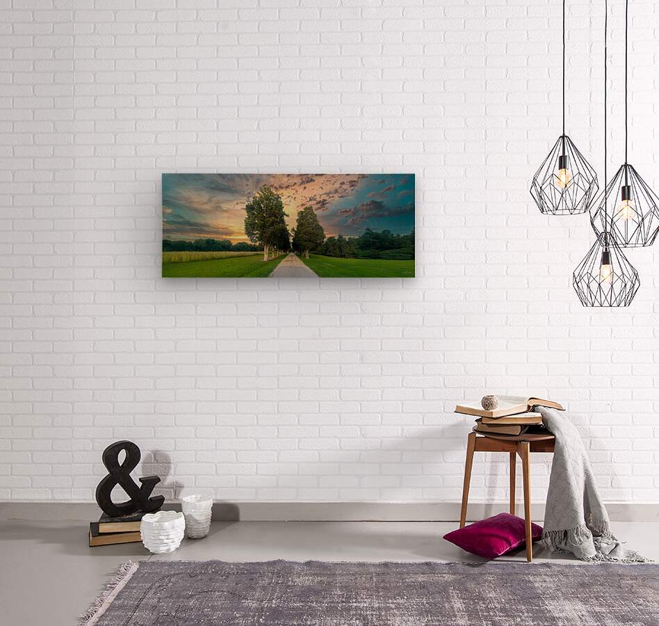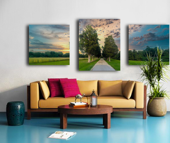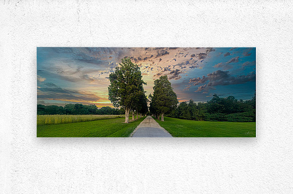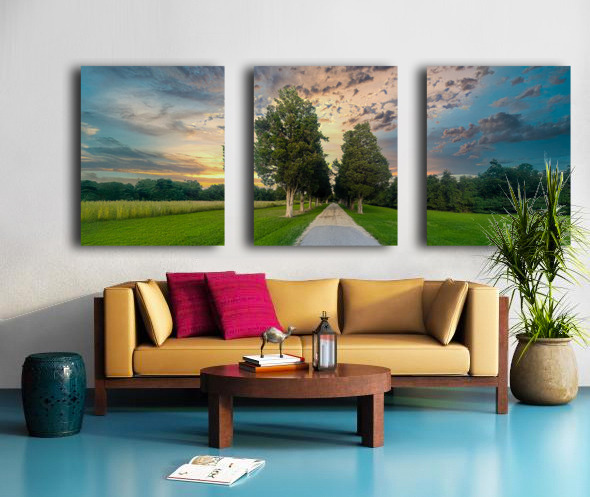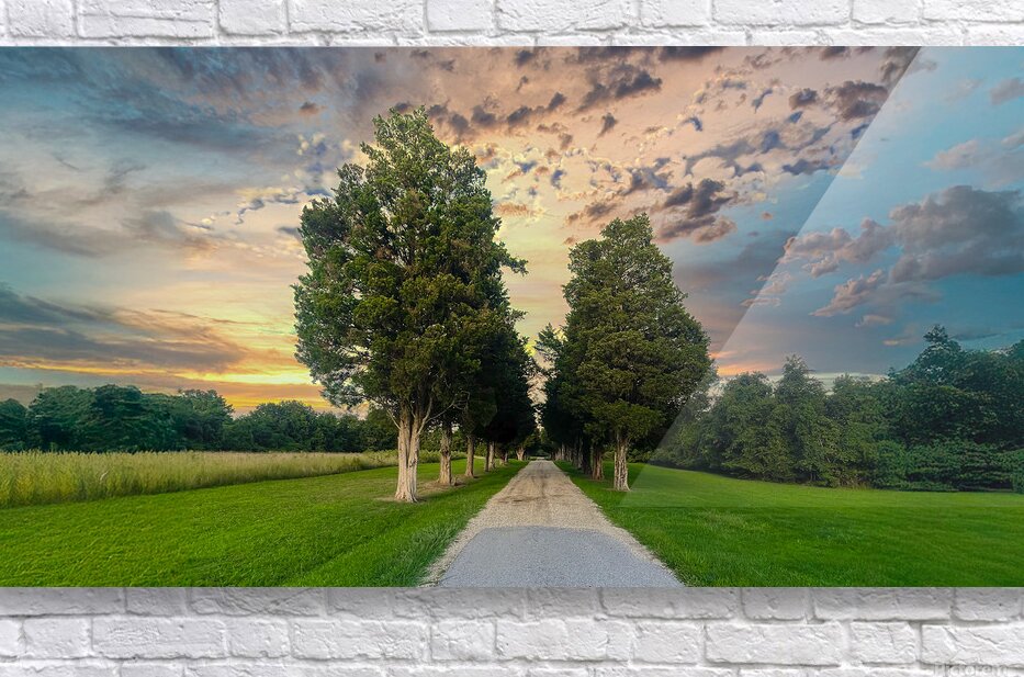 This captivating photograph captures a tranquil country road flanked by tall, lush trees on either side, leading the viewer's eye towards the horizon. The sky above is a stunning tapestry of colors, with a blend of warm oranges and cool blues, dotted with scattered clouds, suggesting either a sunrise or sunset. The vibrant green grass on both sides of the path adds to the serene and peaceful atmosphere of the scene. This image evokes a sense of calm and invites the viewer to imagine walking down this quiet, picturesque road, away from the hustle and bustle of everyday life.
