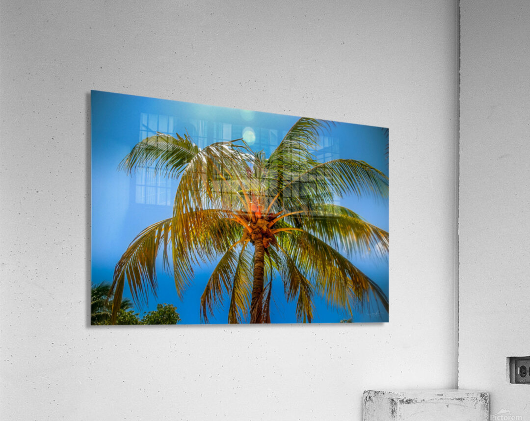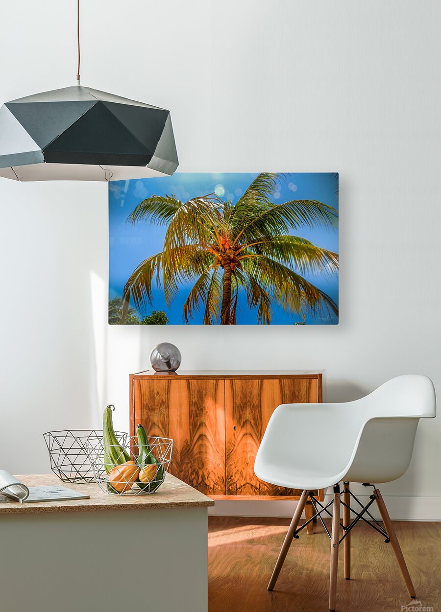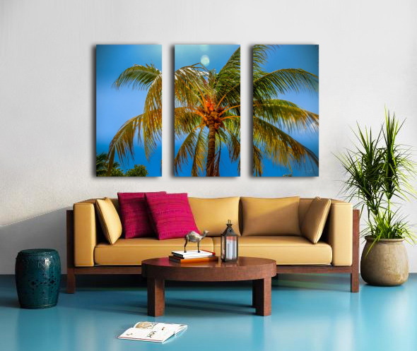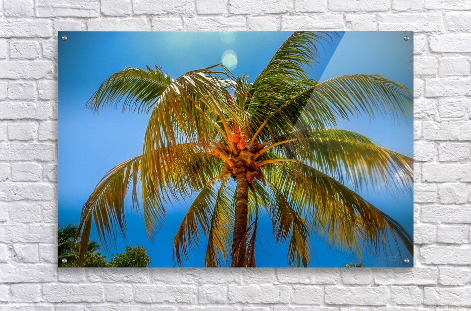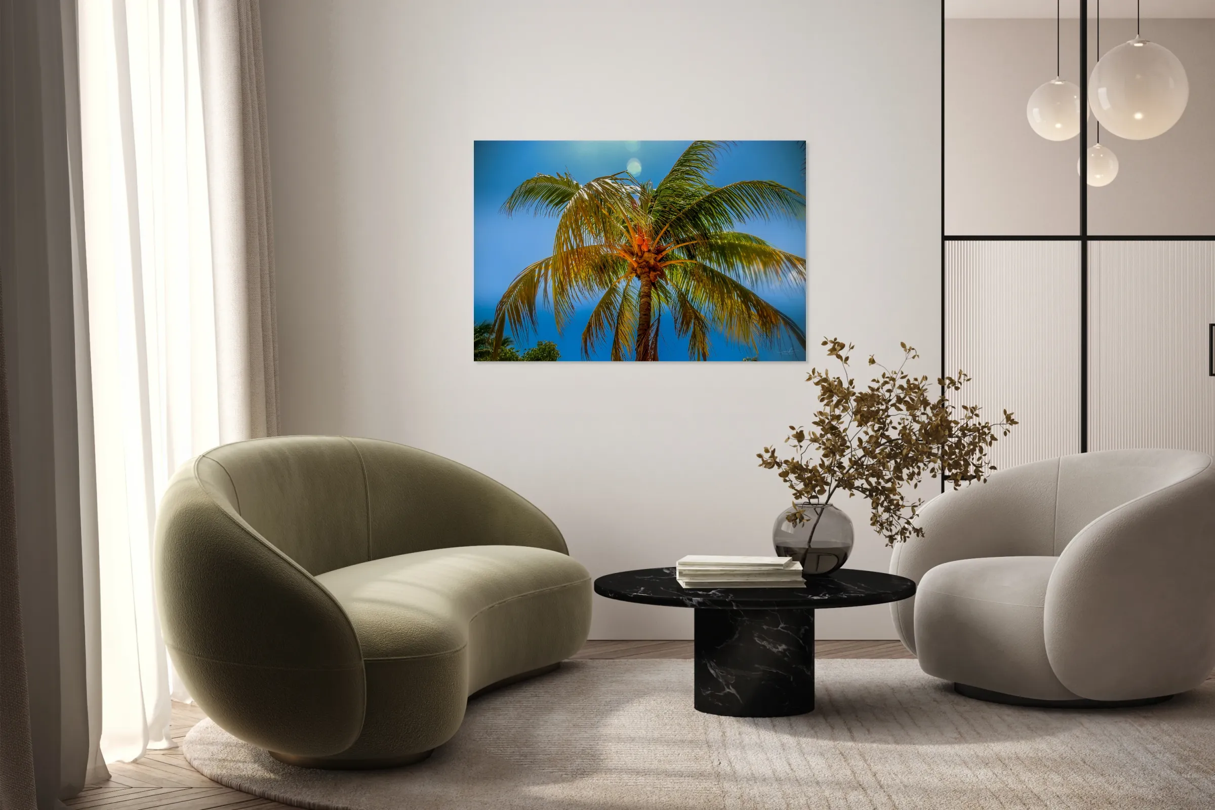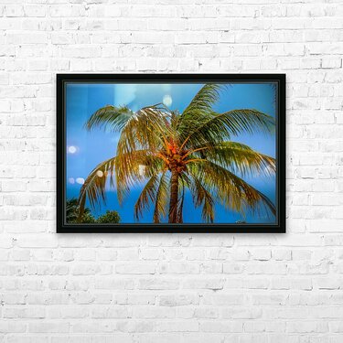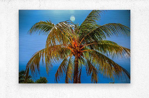 This vibrant and detailed photograph captures a beautiful palm tree set against a clear blue sky. The fronds of the palm tree spread out gracefully, illuminated by the sunlight and creating a captivating interplay of light and shadow. A faint moon is visible in the background, adding a subtle and intriguing element to the composition. The photograph is signed by Michael Henley, whose keen eye for detail and color brings the serene tropical setting to life. The bright colors and tranquil atmosphere make this image a perfect addition to any art gallery, evoking a sense of peace and natural beauty.