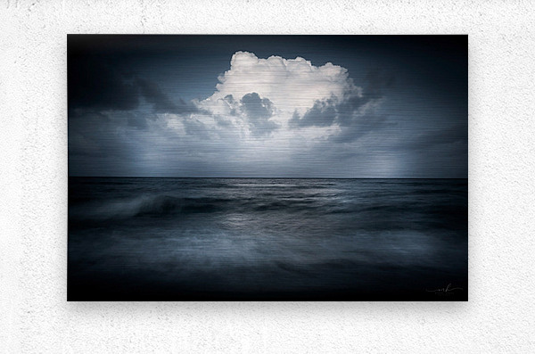 This photograph captures a serene yet dramatic seascape. The image showcases a vast, calm ocean under a moody sky. The water appears to be in gentle motion, with soft waves creating a sense of tranquility. Above the horizon, a large, billowing cloud dominates the sky, illuminated by subtle light, giving it a majestic and almost ethereal quality. The contrast between the dark, brooding sea and the bright, towering cloud creates a striking visual balance, making this image both captivating and thought-provoking. This photograph is a beautiful representation of nature's power and serenity, making it a compelling addition to any art gallery.