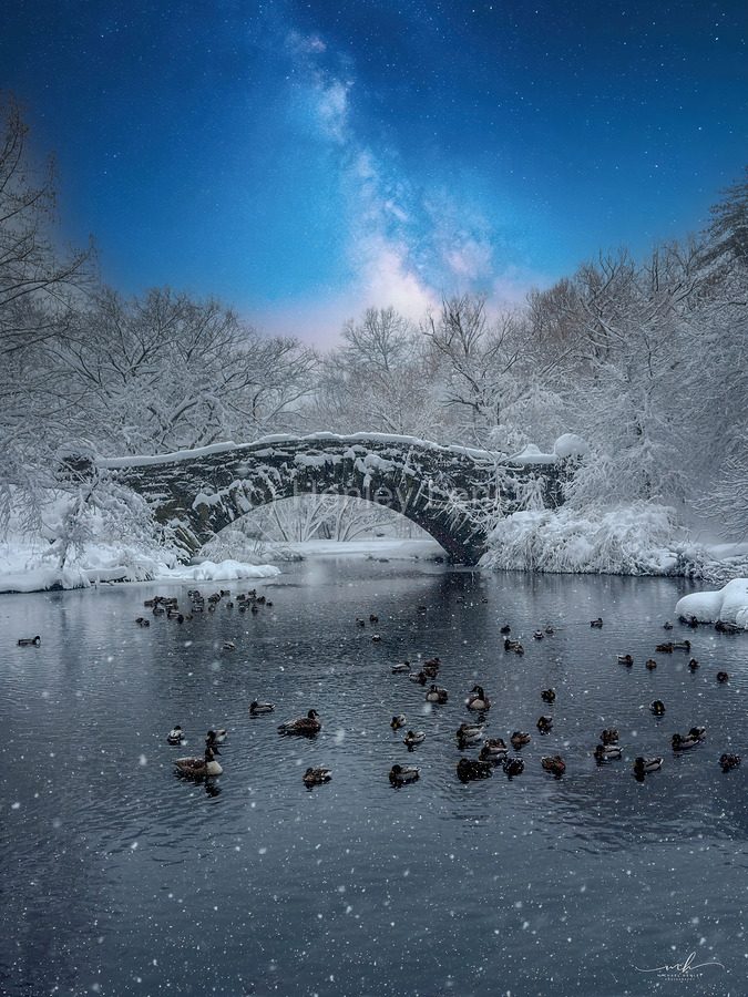 Winter settles over Central Park with a quiet kind of grace. A historic stone bridge arches over a half?frozen pond, its reflection softened by drifti...[+]