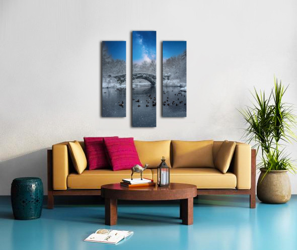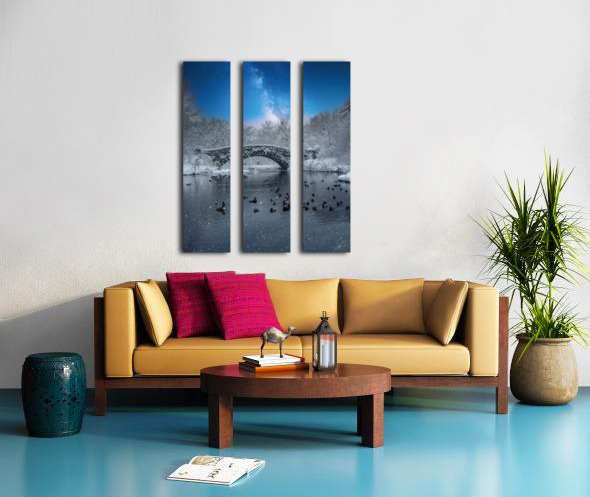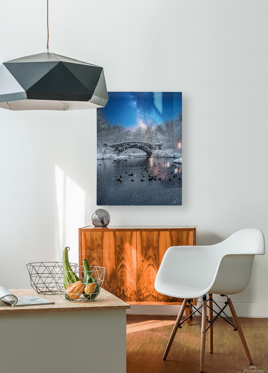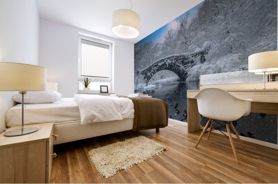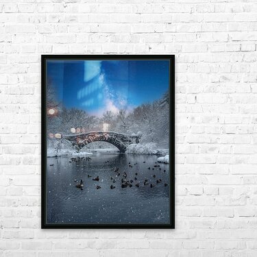 Winter settles over Central Park with a quiet kind of grace. A historic stone bridge arches over a half?frozen pond, its reflection softened by drifting snow. Ducks gather in the cold water, bringing gentle movement to a scene otherwise wrapped in silence. Bare trees frame the moment like natural sculptures, and the sky glows in deep blues that hint at dawn or dusk. This photograph captures the rare serenity of New York City when winter slows the world down and invites you to breathe.