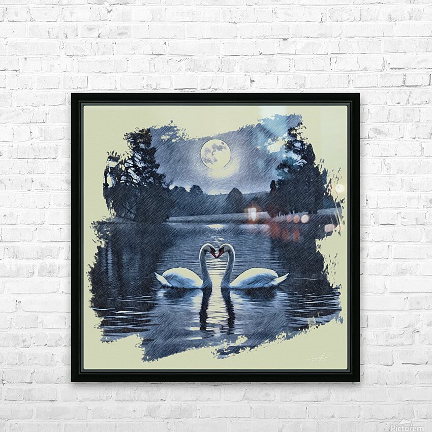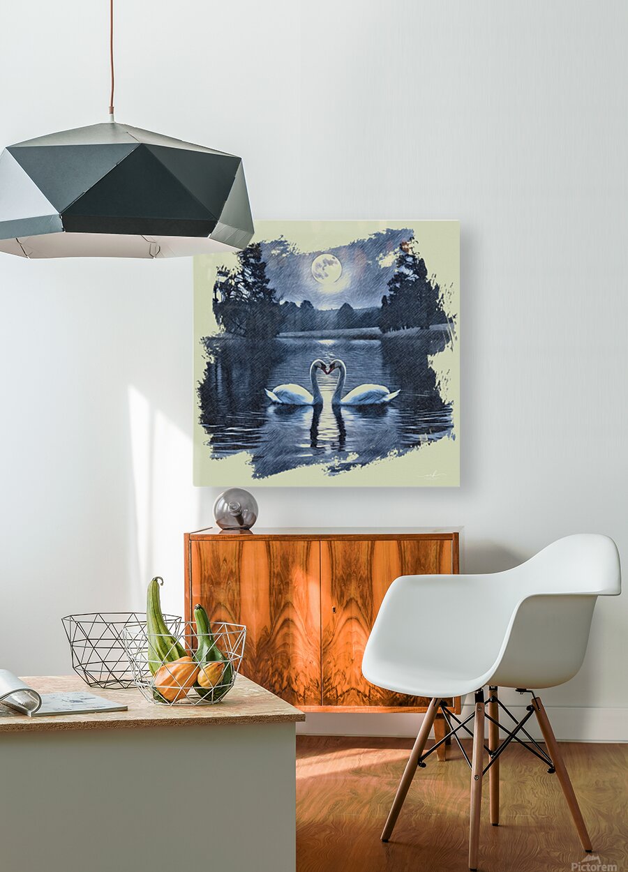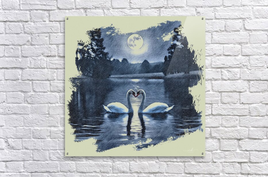 Two swans drift gently across a midnight lake, their curved necks forming a perfect heart beneath the glow of a full moon. Silhouetted trees frame the...[+]