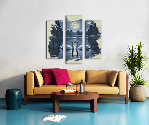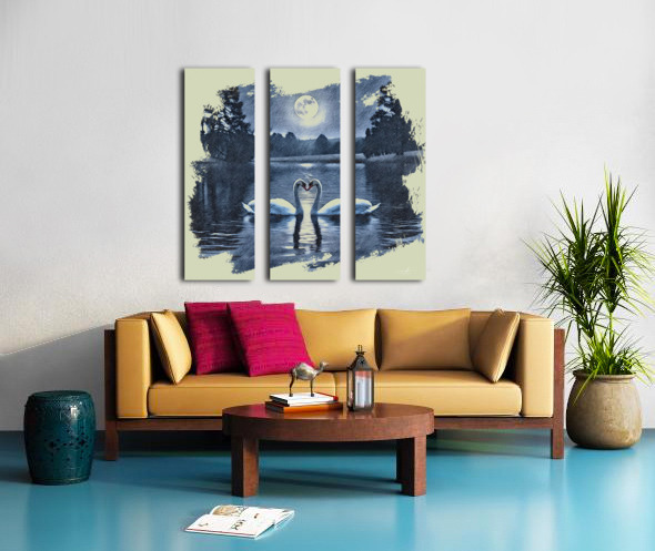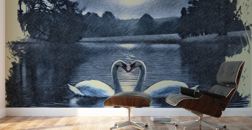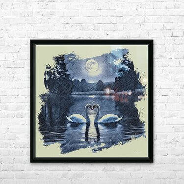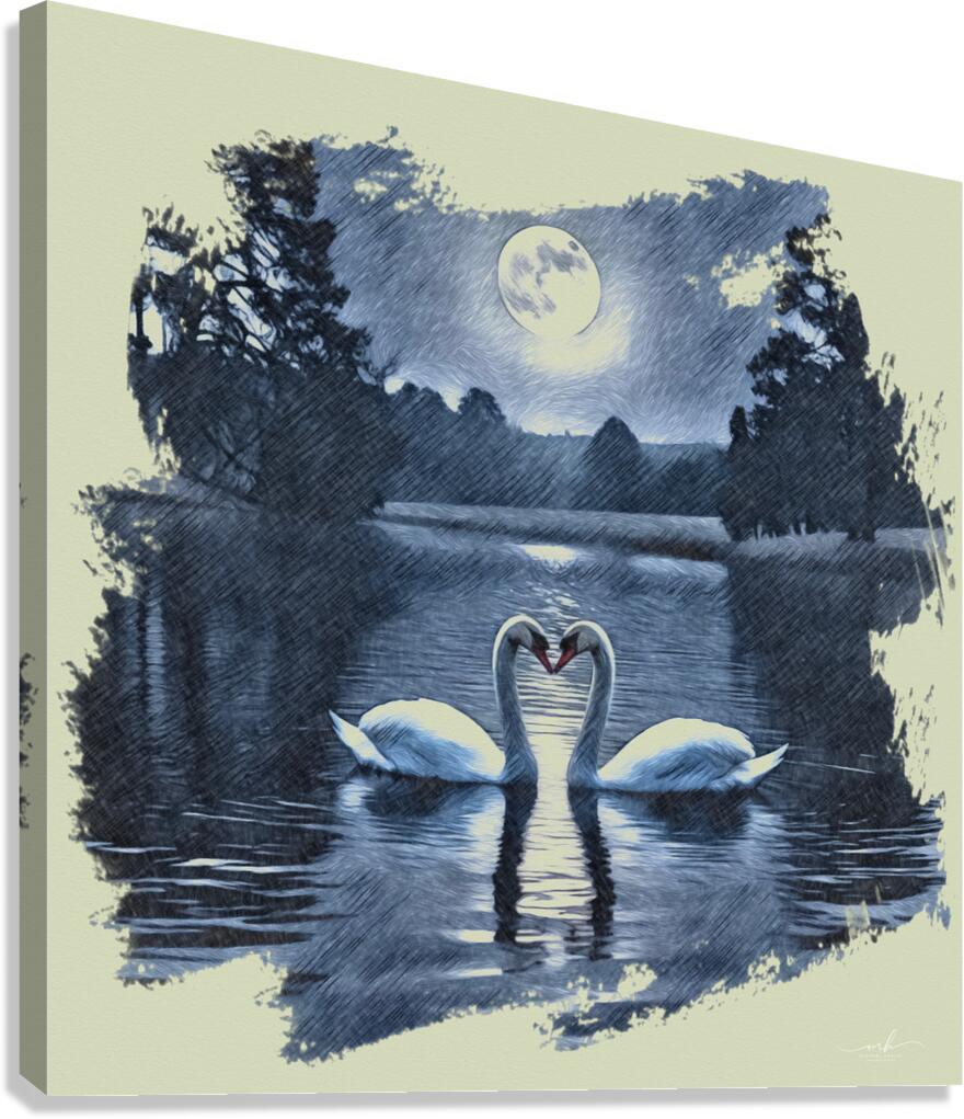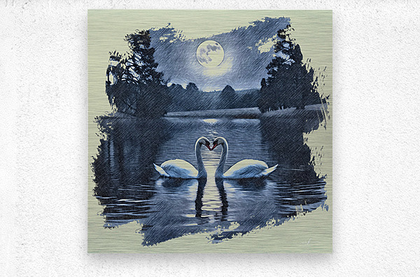 Two swans drift gently across a midnight lake, their curved necks forming a perfect heart beneath the glow of a full moon. Silhouetted trees frame the scene, their reflections shimmering softly on the water’s surface. Rendered in monochromatic blue tones with a sketch-like texture, the image evokes serenity, romance, and timeless connection. The swans, symbols of loyalty and love, appear as soulmates suspended in a dream, making this piece a poetic tribute to enduring affection and quiet beauty.